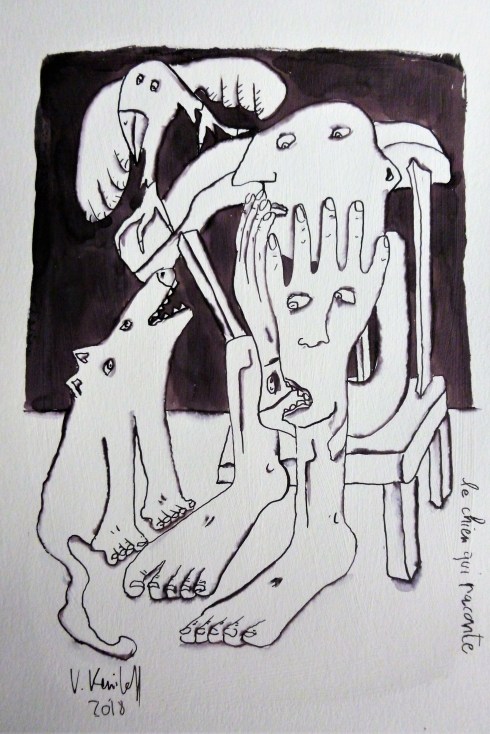 (« Le cheval au galop … mais pas trop » et « L’artiste dissident, excommunié par ses pères – parce qu’il ne répond pas aux critères du moment – protège sa création de la bêtise humaine en faisant de son corps un barrage virtuel et symbolique. Victime de sa passion pour l’art et pour son art, Il expose sa dernière création avec réticence, genoux et bras croisés dans une posture défensive, le regard provocateur, seul signe extérieur de son mépris d’un système dont le rejet de l’art « ancien » et du beau, fait de lui et de sa peinture de simples dommages collatéraux de l’histoire de l’art. »(extrait de texte d’Yves Krief)