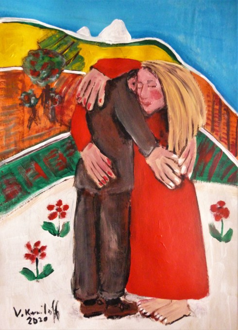 *Acrylique sur papier naturel, 40/30cm, peinture inspirée du poème « Il lui disait » de Victor Hugo (recueil Les Contemplations) Il lui disait : « Vois-tu, si tous deux nous pouvions, L’âme pleine de foi, le cœur plein de rayons, Ivres de douce extase et de mélancolie, Rompre les mille nœuds dont la ville nous lie ; Si nous pouvions quitter ce Paris triste et fou, Nous fuirions ; nous irions quelque part, n’importe où, Chercher loin des vains bruits, loin des haines jalouses, Un coin où nous aurions des arbres, des pelouses ; Une maison petite avec des fleurs, un peu De solitude, un peu de silence, un ciel bleu, La chanson d’un oiseau qui sur le toit se pose, De l’ombre ; — et quel besoin avons-nous d’autre chose ? » Juillet 18…