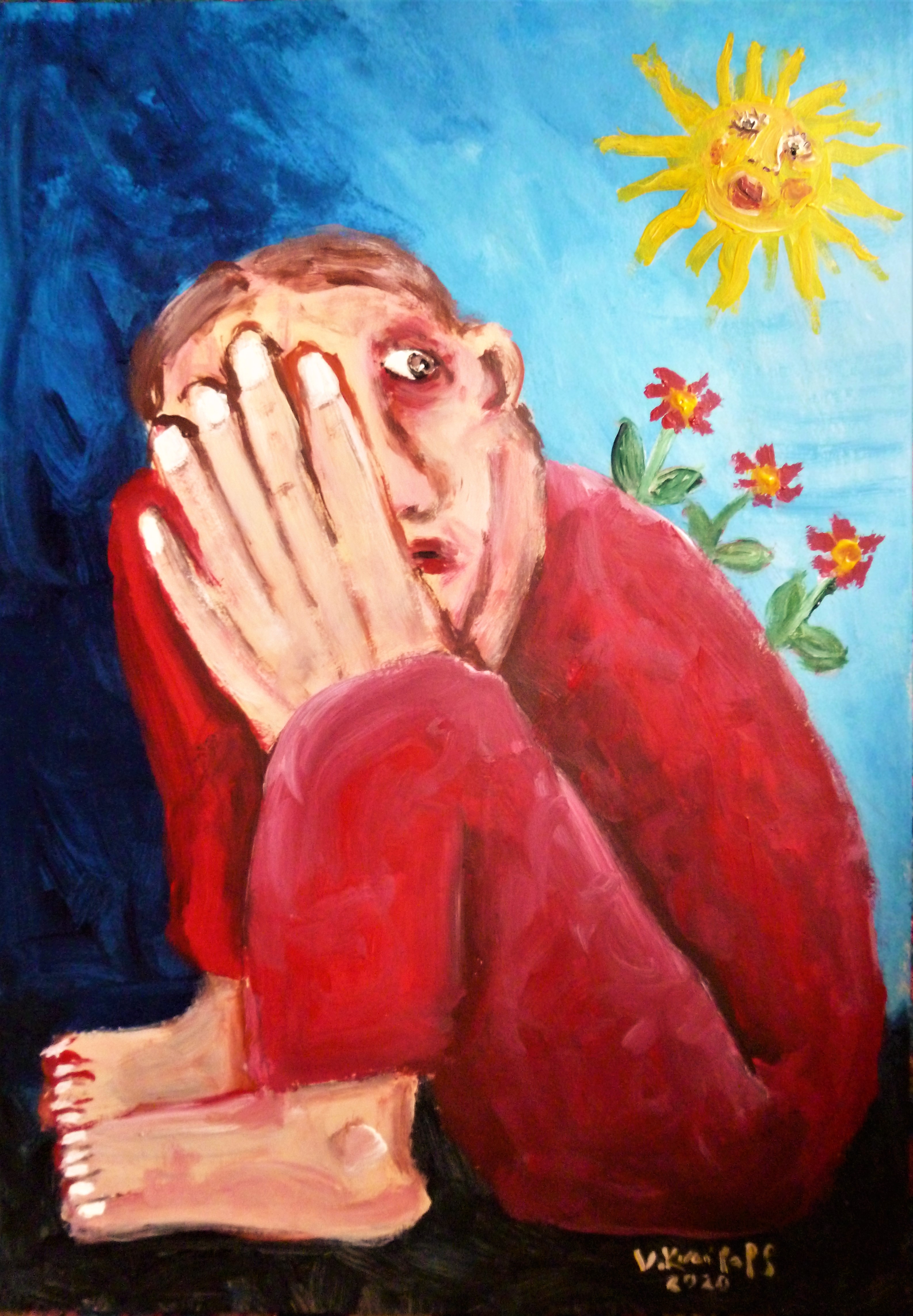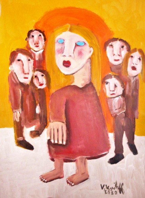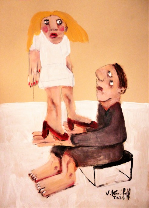 *Acrylique sur papier naturel, 40/30cm. peinture inspirée du passage de la rencontre de Kitty et Levine dans le roman de Tolstoï, « Anna Karénine ». (Édition de référence : Paris, Librairie Hachette et Cie, 1896. Huitième édition.) « …/Debout auprès d’une dame, du côté opposé à celui où Levine se trouvait, elle (Kitty) ne se distinguait de son entourage ni par sa pose ni par sa toilette ; pour lui, elle ressortait dans la foule comme une rose parmi des orties. Elle était le sourire qui illumine tout autour de soi. « Oserai-je vraiment descendre sur la glace et m’approcher d’elle?» pensa-t-il. L’endroit où elle se tenait lui parut un sanctuaire dont il craignait d’approcher, et il eut si peur qu’il s’en fallut de peu qu’il ne repartit. Faisant un effort sur lui-même il arriva cependant à se persuader qu’elle était entourée de gens de toute espèce, et qu’à la rigueur il avait bien aussi le droit de venir patiner. Il descendit donc sur la glace, évitant de la regarder en face comme le soleil, mais de même que le soleil, il n’avait pas besoin de la regarder pour la voir. /… »