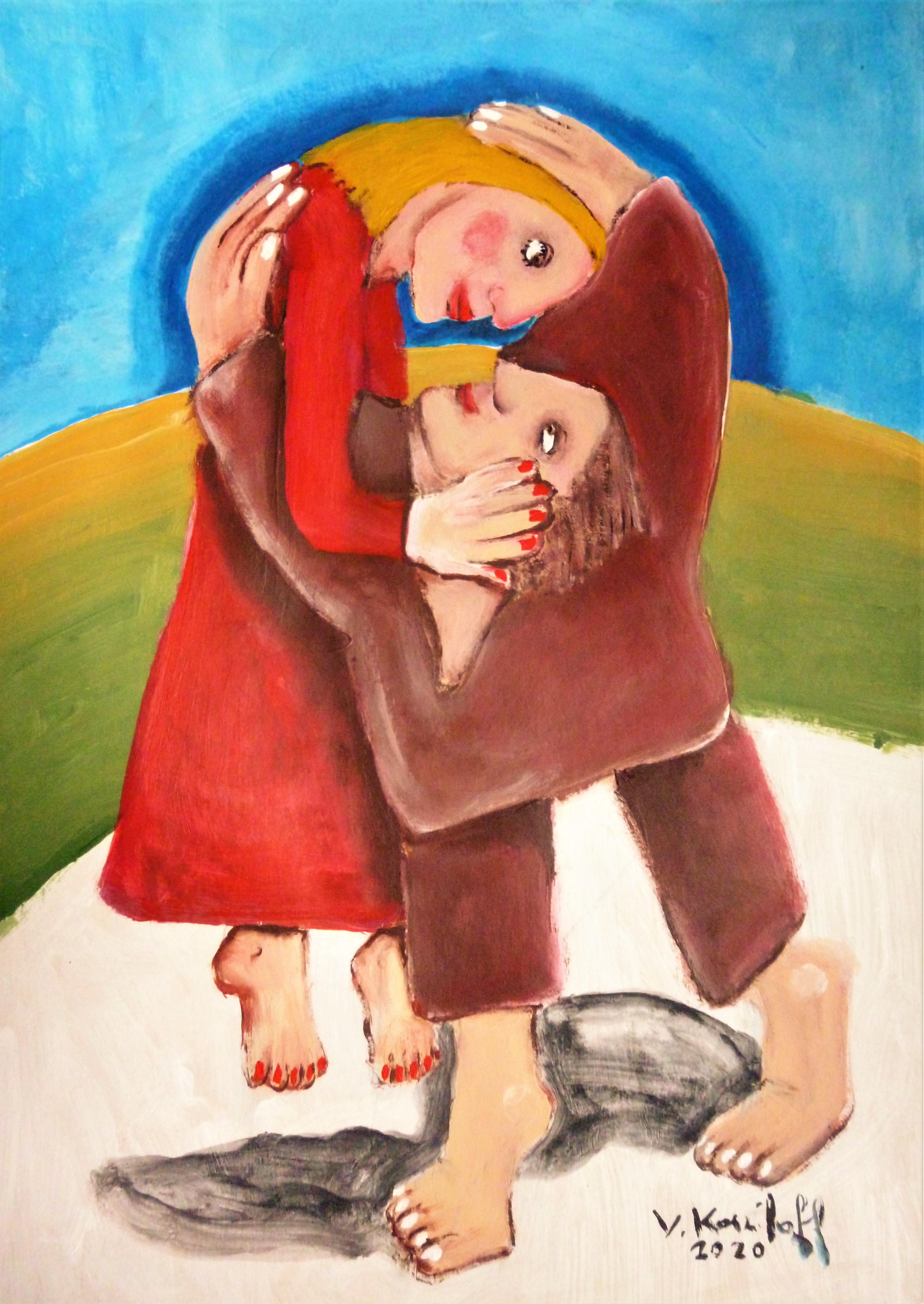 *Acrylique sur papier, 40/30cm, peinture inspiré par ce passage de la pièce de théâtre « Cyrano de Bergerac » de Edmond Rostand. « …/ Un baiser, mais à tout prendre, qu’est-ce? Un serment fait d’un peu plus près, une promesse Plus précise, un aveu qui se veut confirmer, Un point rose qu’on met sur l’i du verbe aimer; C’est un secret qui prend la bouche pour oreille, Un instant d’infini qui fait un bruit d’abeille, Une communion ayant un goût de fleur, Une façon d’un peu se respirer le cœur, Et d’un peu se goûter, au bord des lèvres, l’âme. …/ »