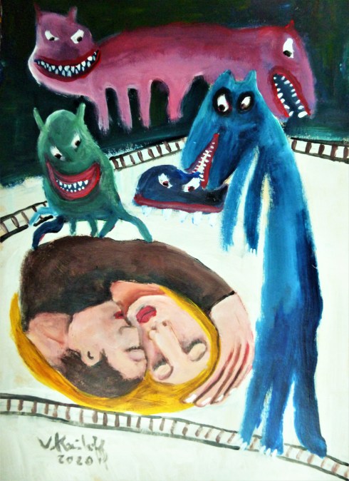 *Acrylique sur papier naturel, 40/30cm peinture inspirée par le poème éponyme d’Arthur Rimbaud. L’hiver nous irons dans un petit wagon rose Avec des coussins bleus. Nous serons bien. Un nid de baisers fous repose Dans chaque coin moelleux. Tu fermeras l’œil, pour ne point voir par la glace, Grimacer les ombres des soirs, Ces monstruosités hargneuses, populace De démons noirs et de loups noirs. Puis tu te sentiras la joue égratignée… Un petit baiser, comme une folle araignée, Te courra par le cou… Et tu me diras : “Cherche !” en inclinant la tête, — Et nous prendrons du temps à trouver cette bête — Qui voyage beaucoup…