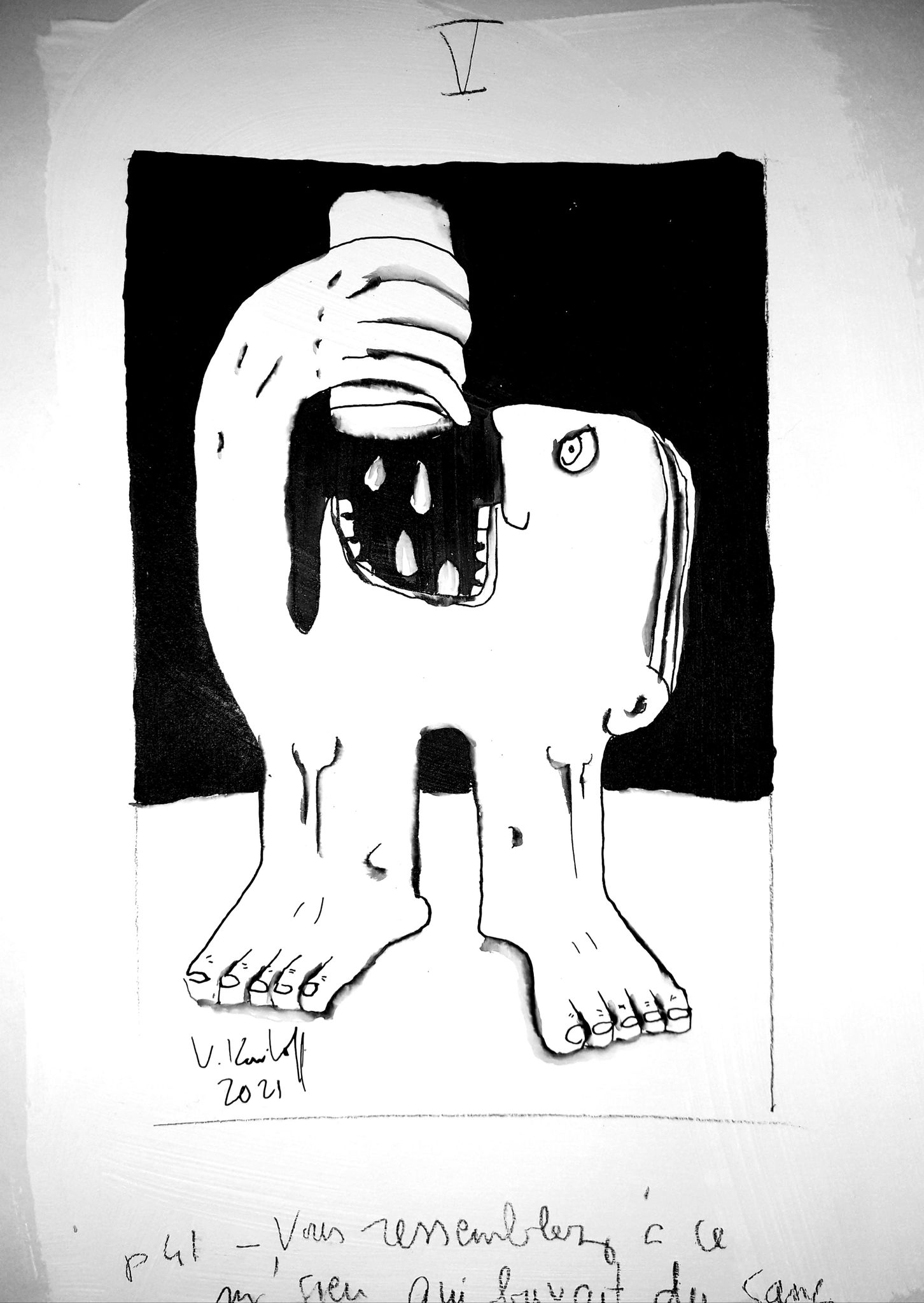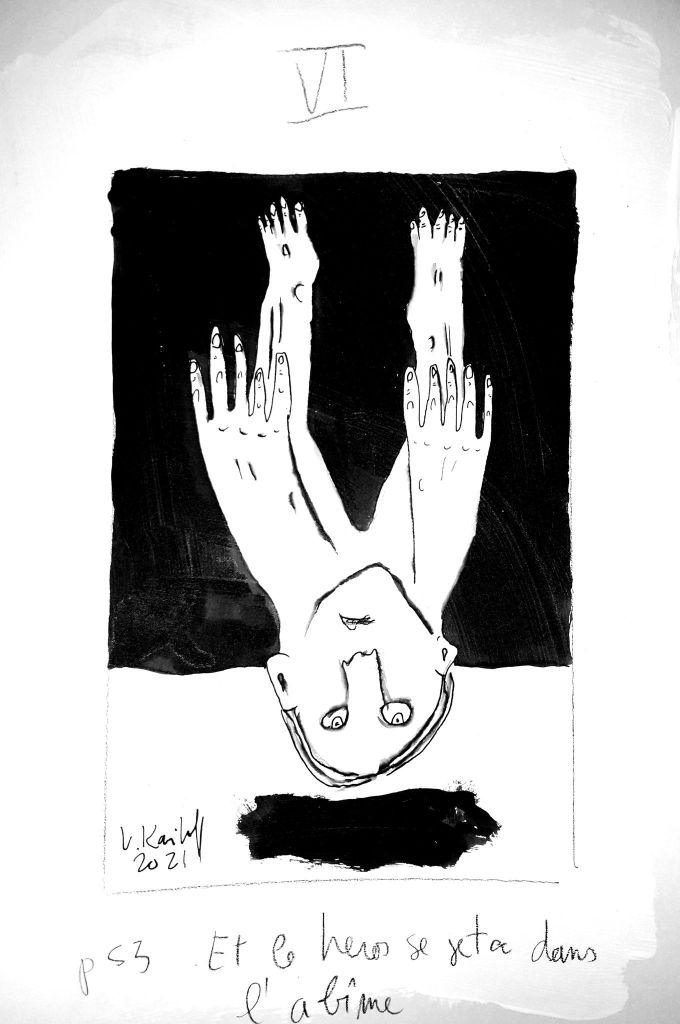 Les dessins émanent de l’univers de l’artiste mécontemporain Vadim Korniloff, dessinateur à la compulsion automatique et dramatique. »