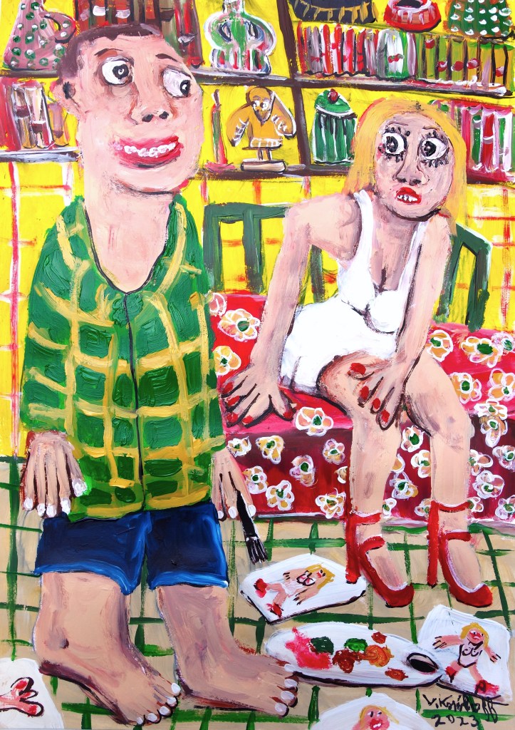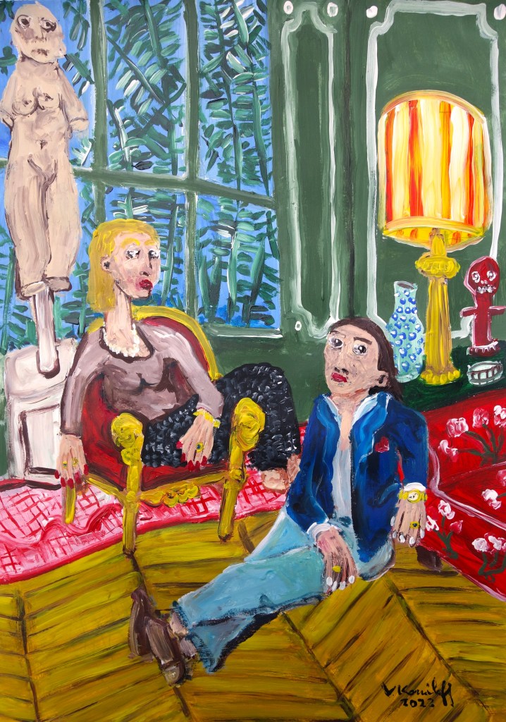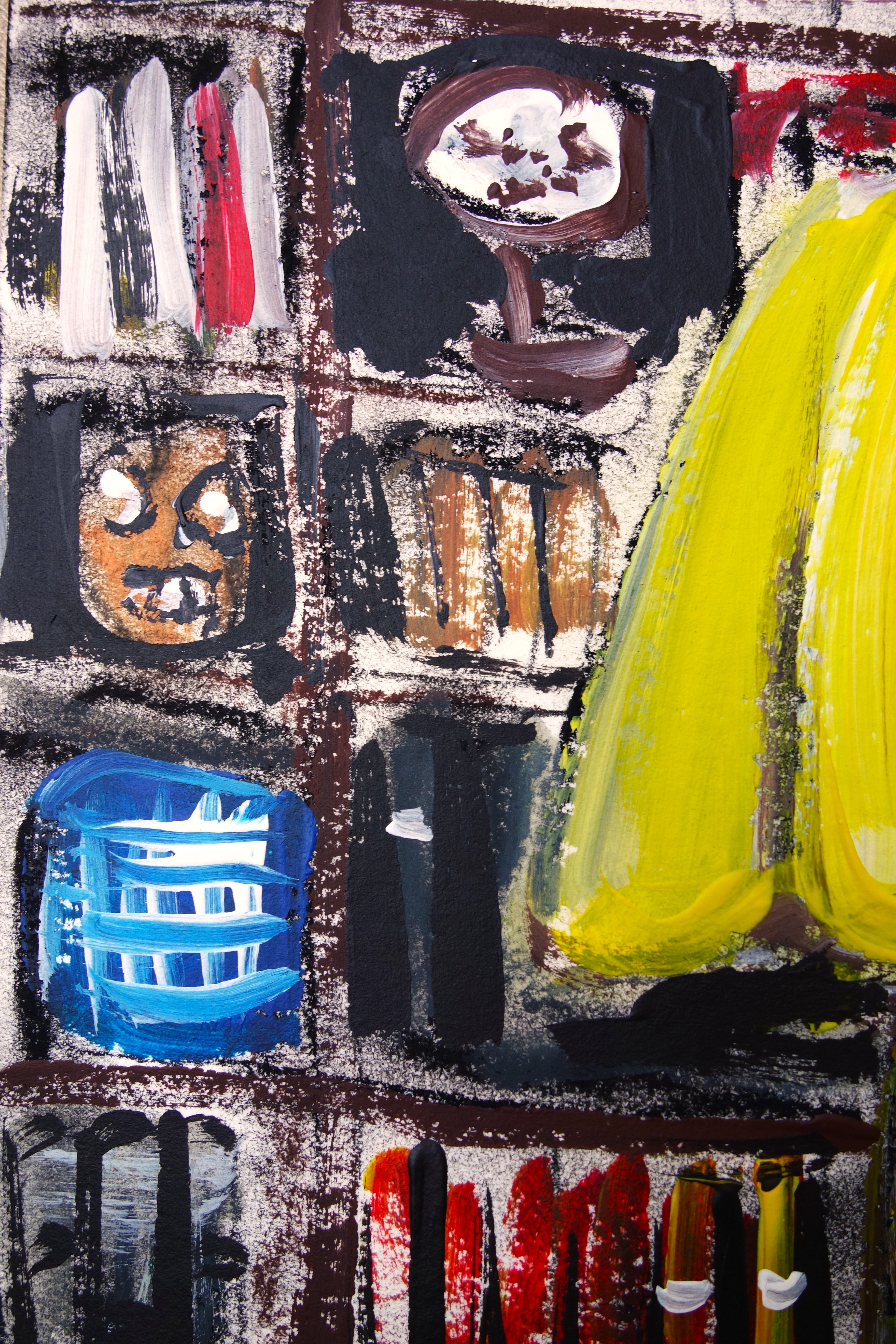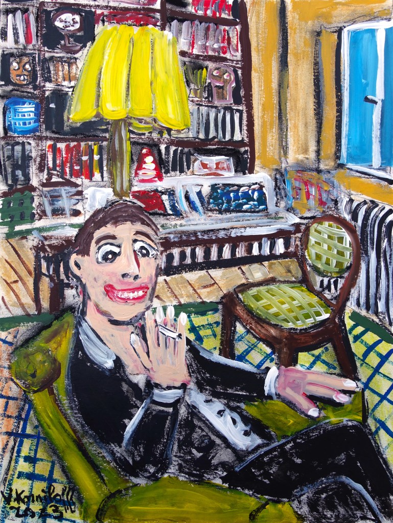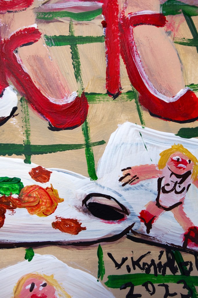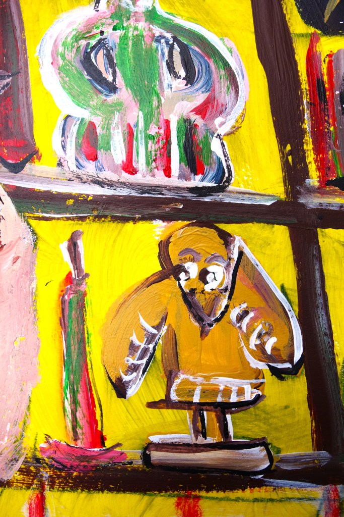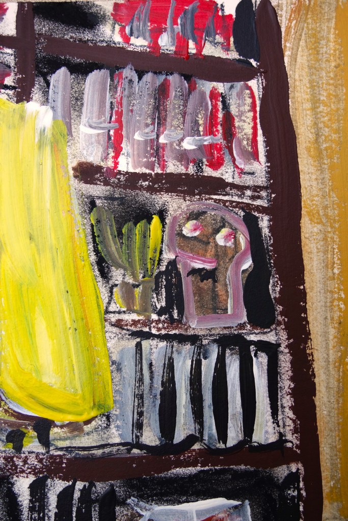 …/ elle fut attristée de comprendre qu’il devait avoir des problèmes d’argent. En effet, Benoit lui avait répondu que le budget du matériel de peinture était suffisamment onéreux pour voir des femmes à poil. (Acrylique sur papier, 60/40cm. Photos œuvre et détails.)