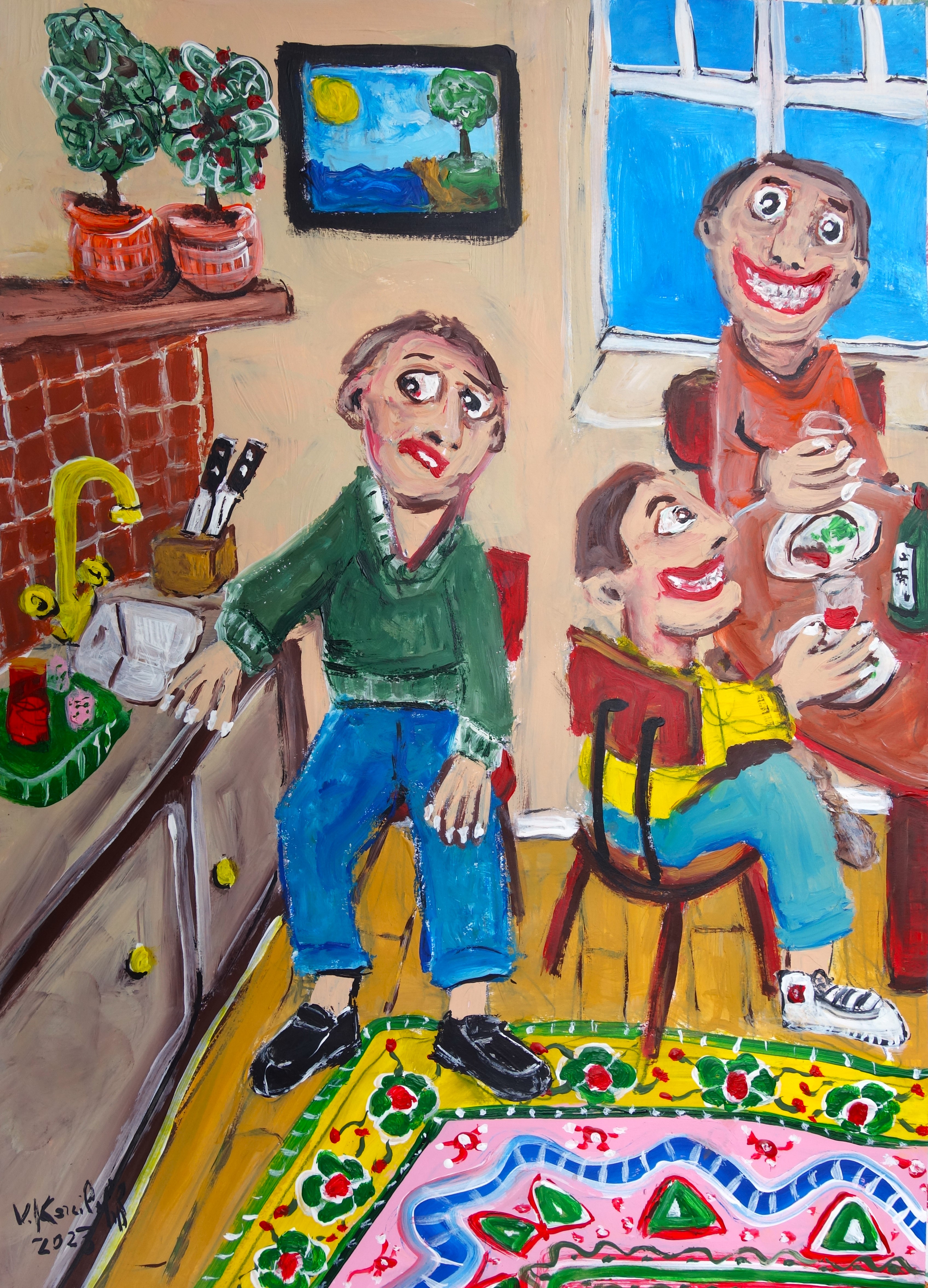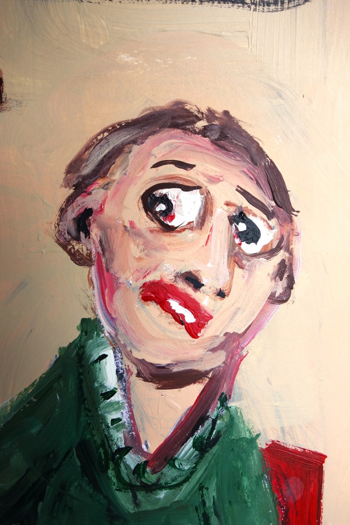 « …/ En effet, Hugo et Jules étaient désormais parfaitement intégrés dans l’époque, au point qu’Hugo arborait des baskets à la mode ! De plus tout signe extérieur réactionnaire, comme le port de mocassins, était devenu pour eux prétexte à la moquerie, et Charles fit les frais de leurs ricanements toute la soirée. Puis, Charles remarqua les couteaux de cuisine… » (Acrylique sur papier, 60/40cm, photos œuvre et détails).