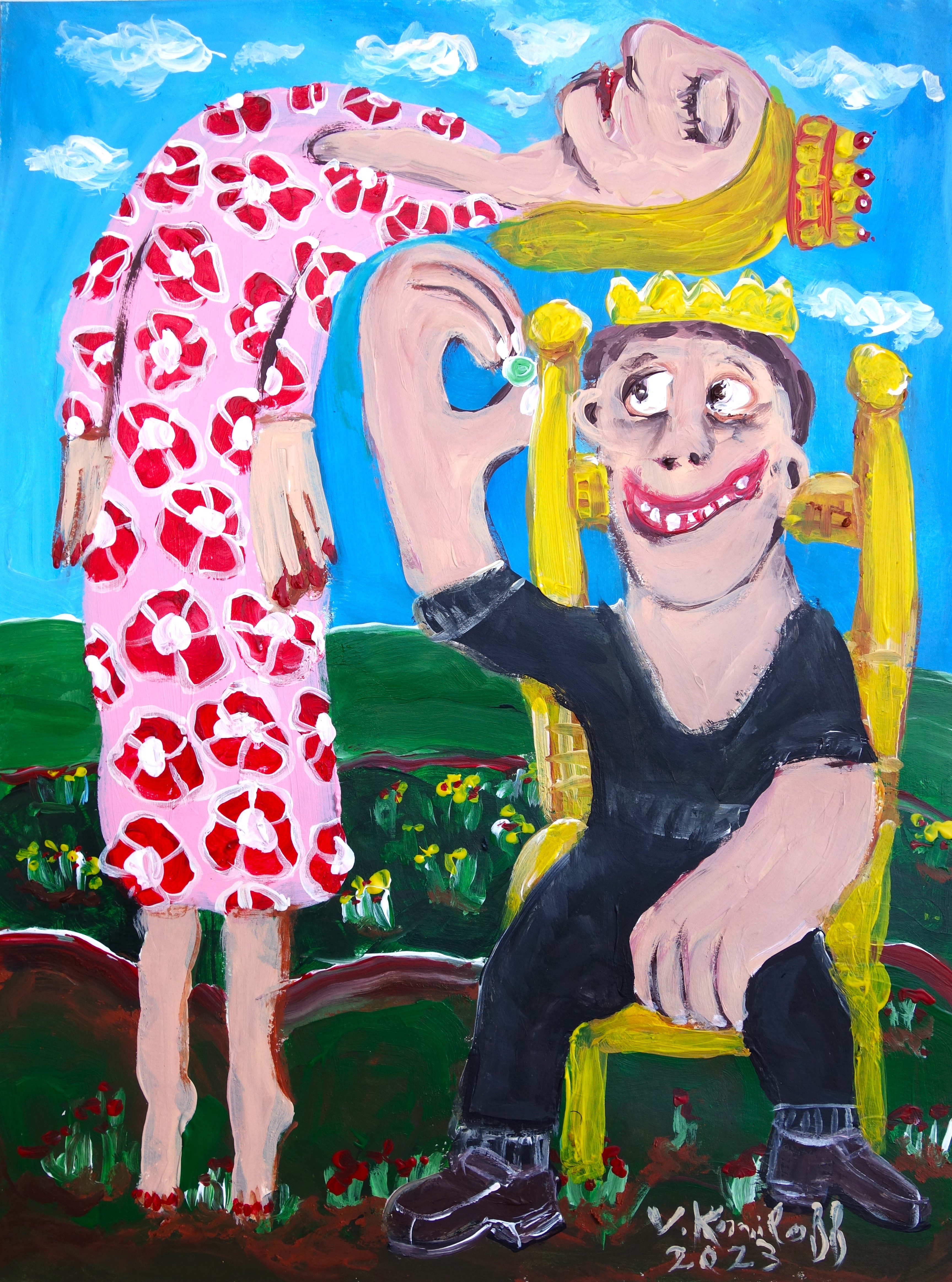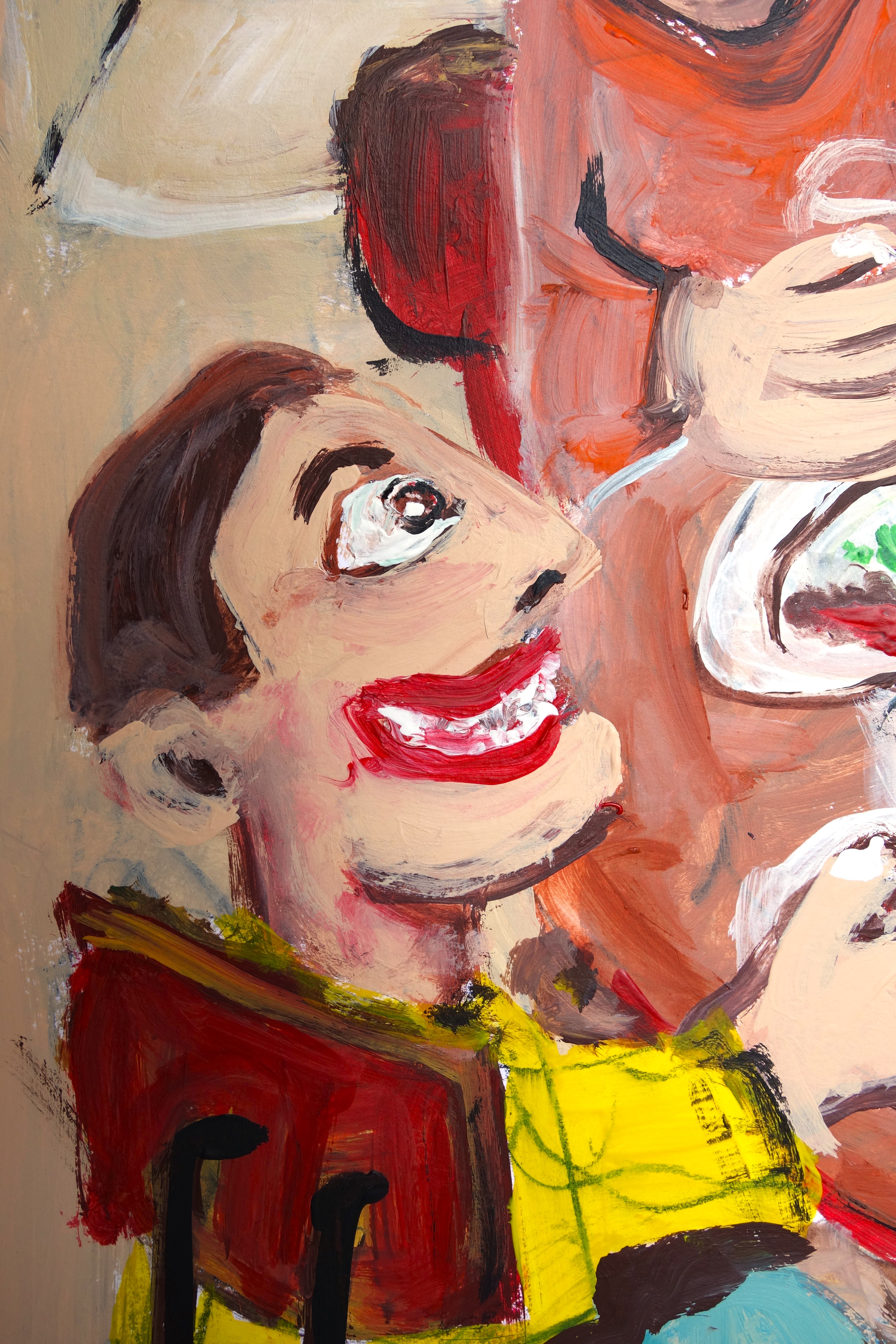 …/ n’entendirent plus rien pendant un long moment. Comme à son habitude, Patrick vint gâcher les vacances. Mais l’histoire finit bien, ce fut en effet durant l’enterrement de Patrick que Josiane accepta la main de Kevin. » (acrylique sur papier, 60/40cm).