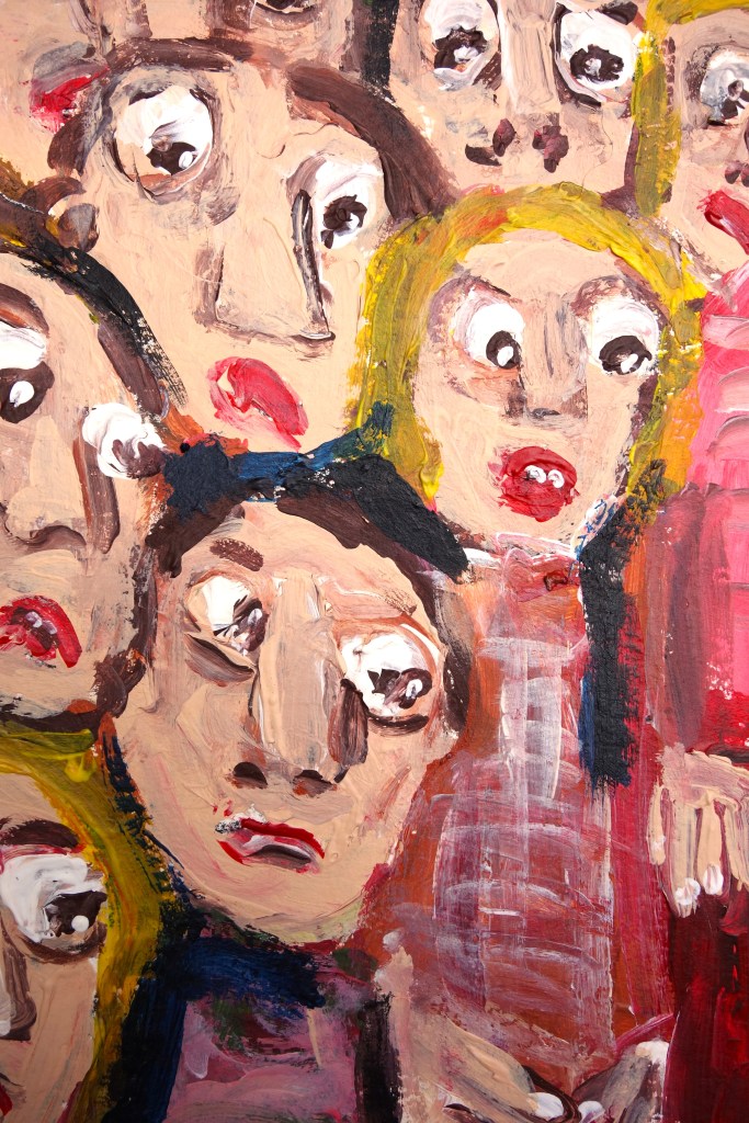 …/ C’est en surfant sur le site « Copains d’avant » qu’il organisa cette rencontre. Puis, à l’apéritif, les souvenirs de Patrick revenaient peu à peu, et il comprit qu’il allait passer une soirée de merde. En effet, lui seul su à cet instant qu’il s’était trompé en indiquant le nom du lycée sur ledit site. » (Acrylique sur papier, 20/20cm)