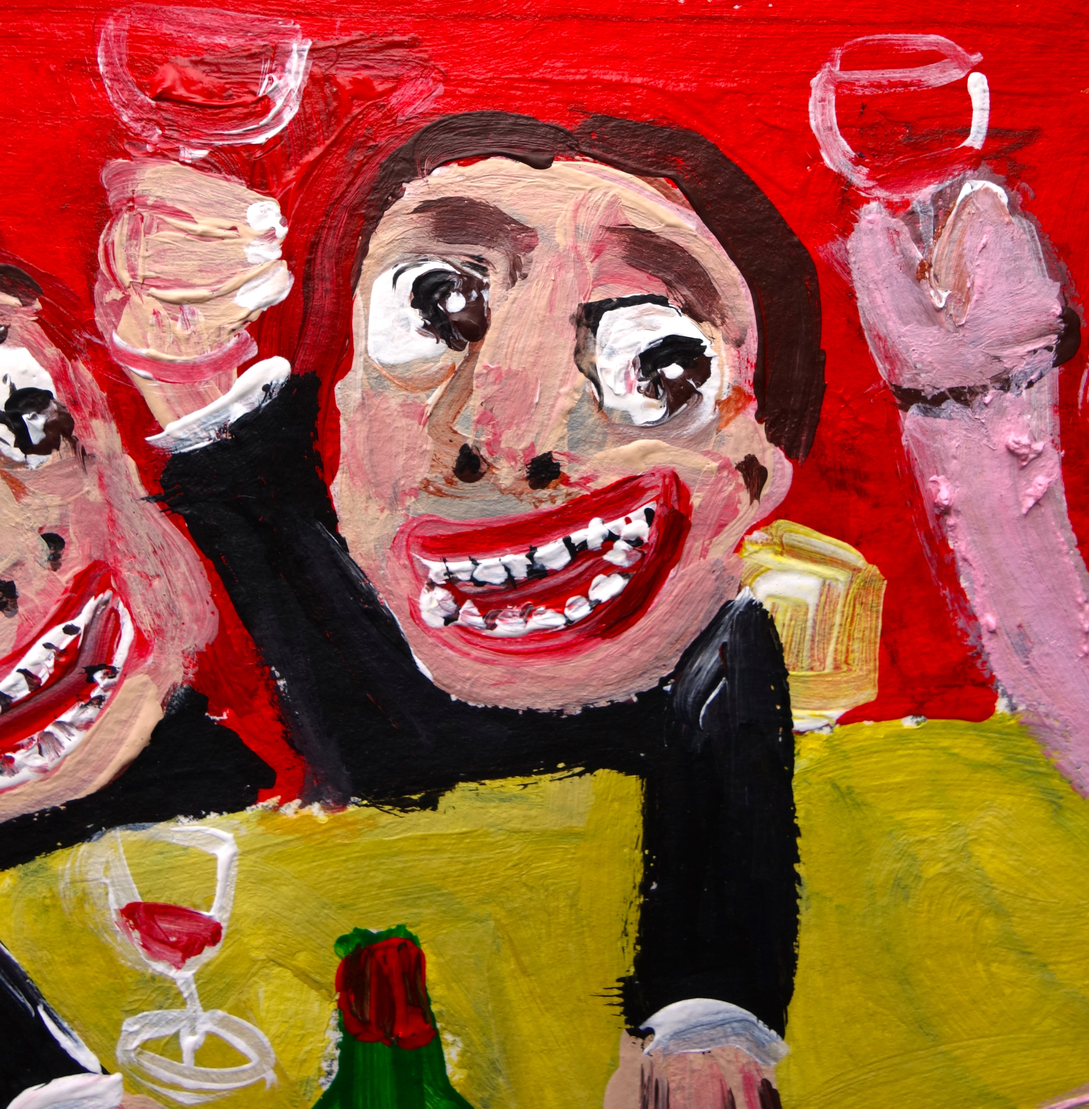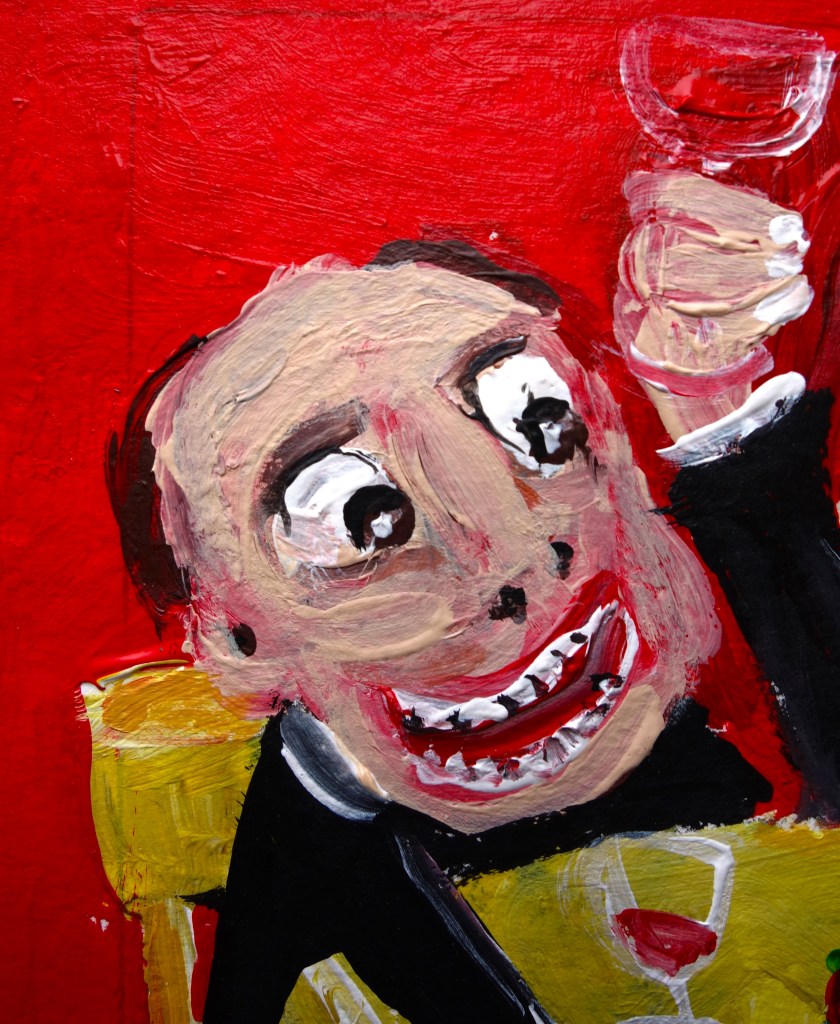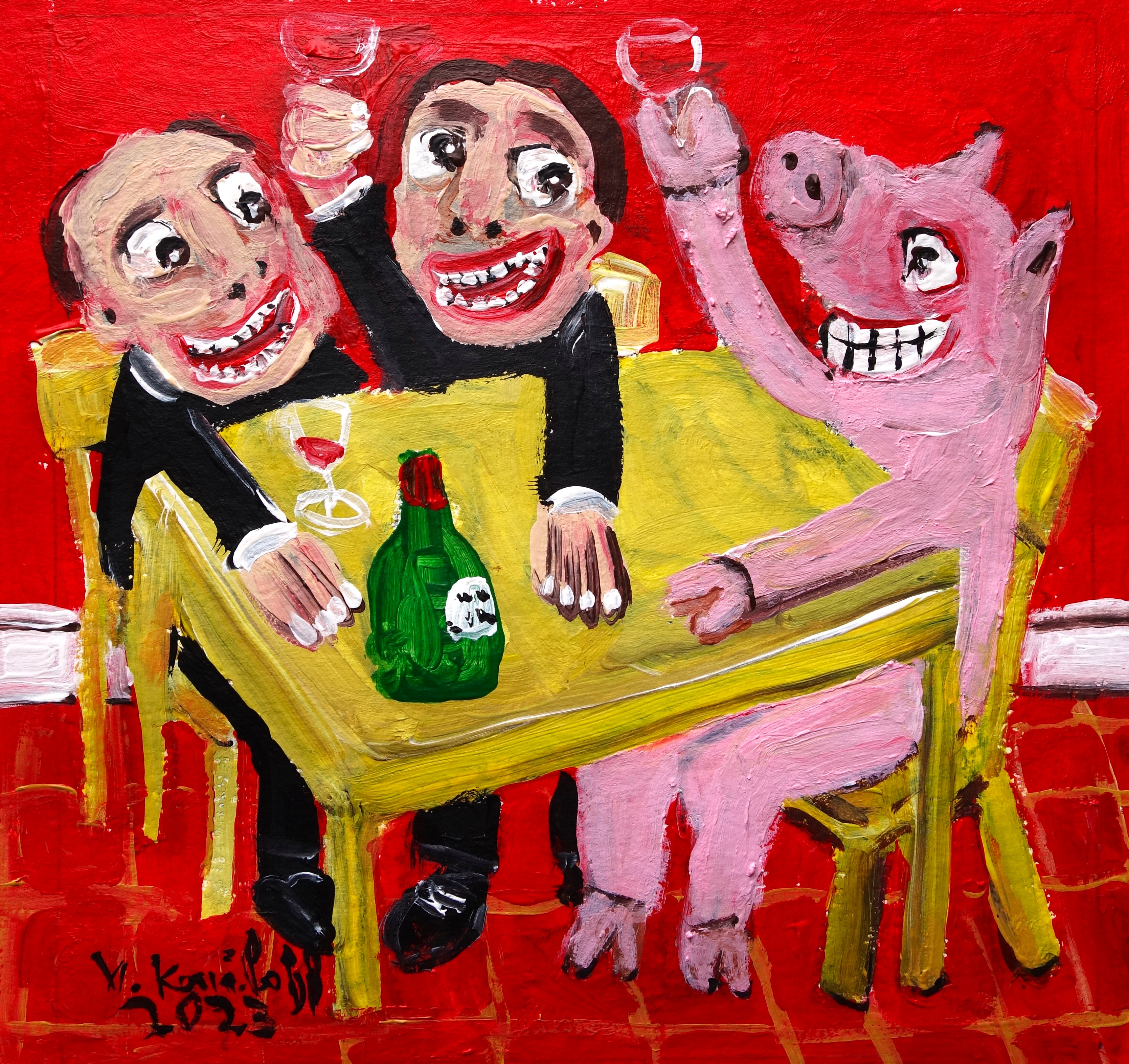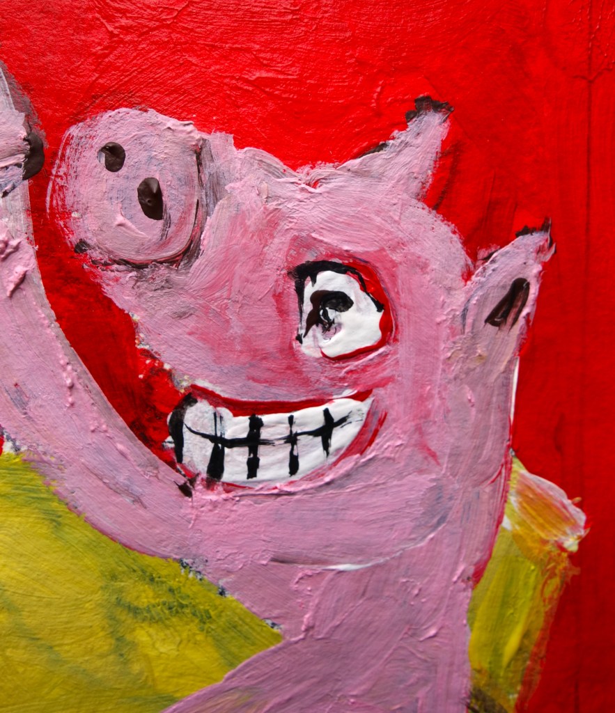 …/ s’organisaient tous les soirs des apéros très arrosés. Ce soir-là, tout en se marrant, le cochon ne pouvait pas s’empêcher de se questionner : À quel moment ces deux abrutis allaient ils comprendre qu’il n’était qu’un cochon ? » (Acrylique sur papier, dim 20/20cm, photos détails et oeuvre)