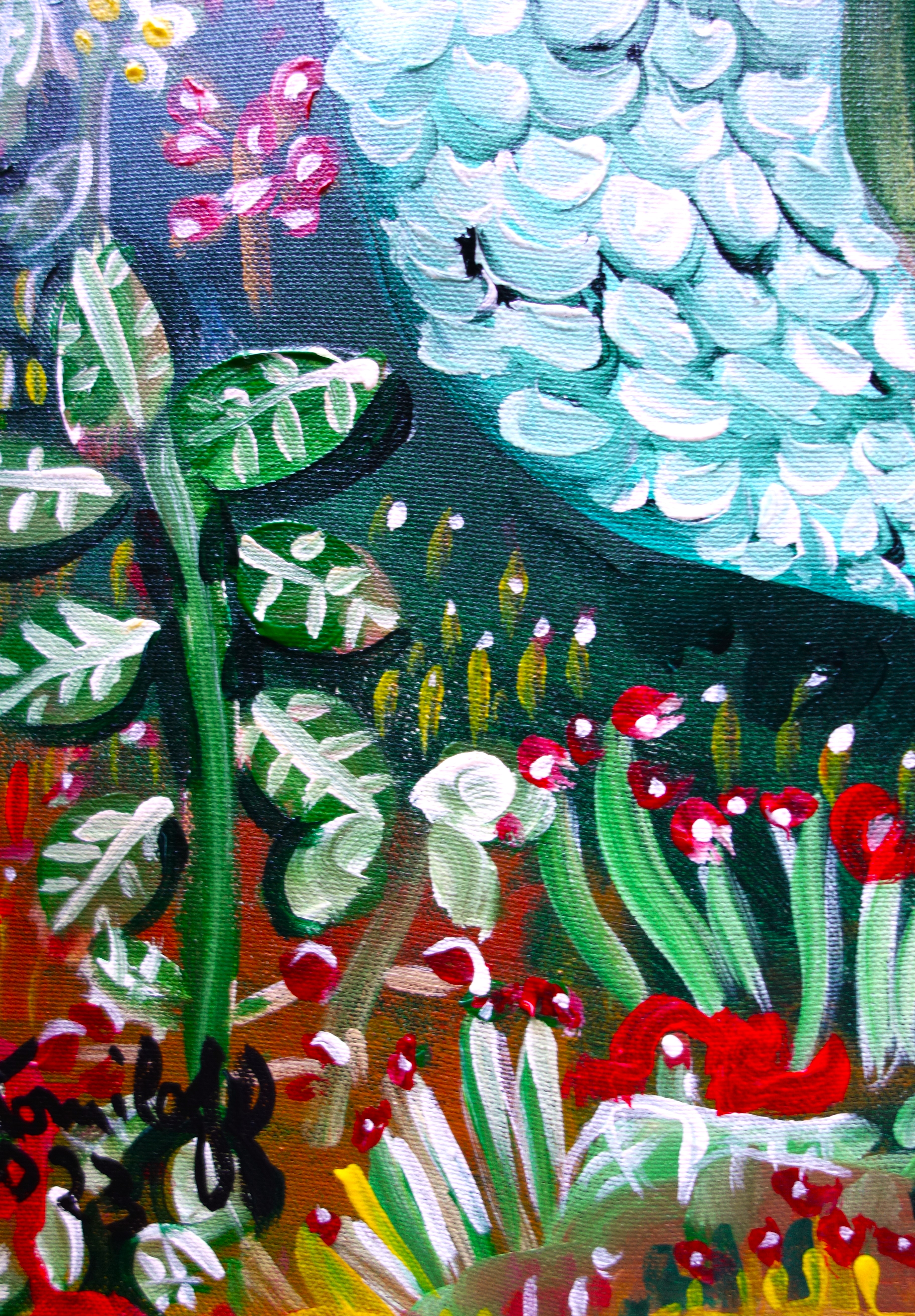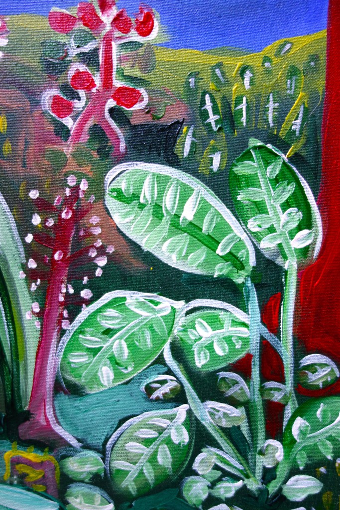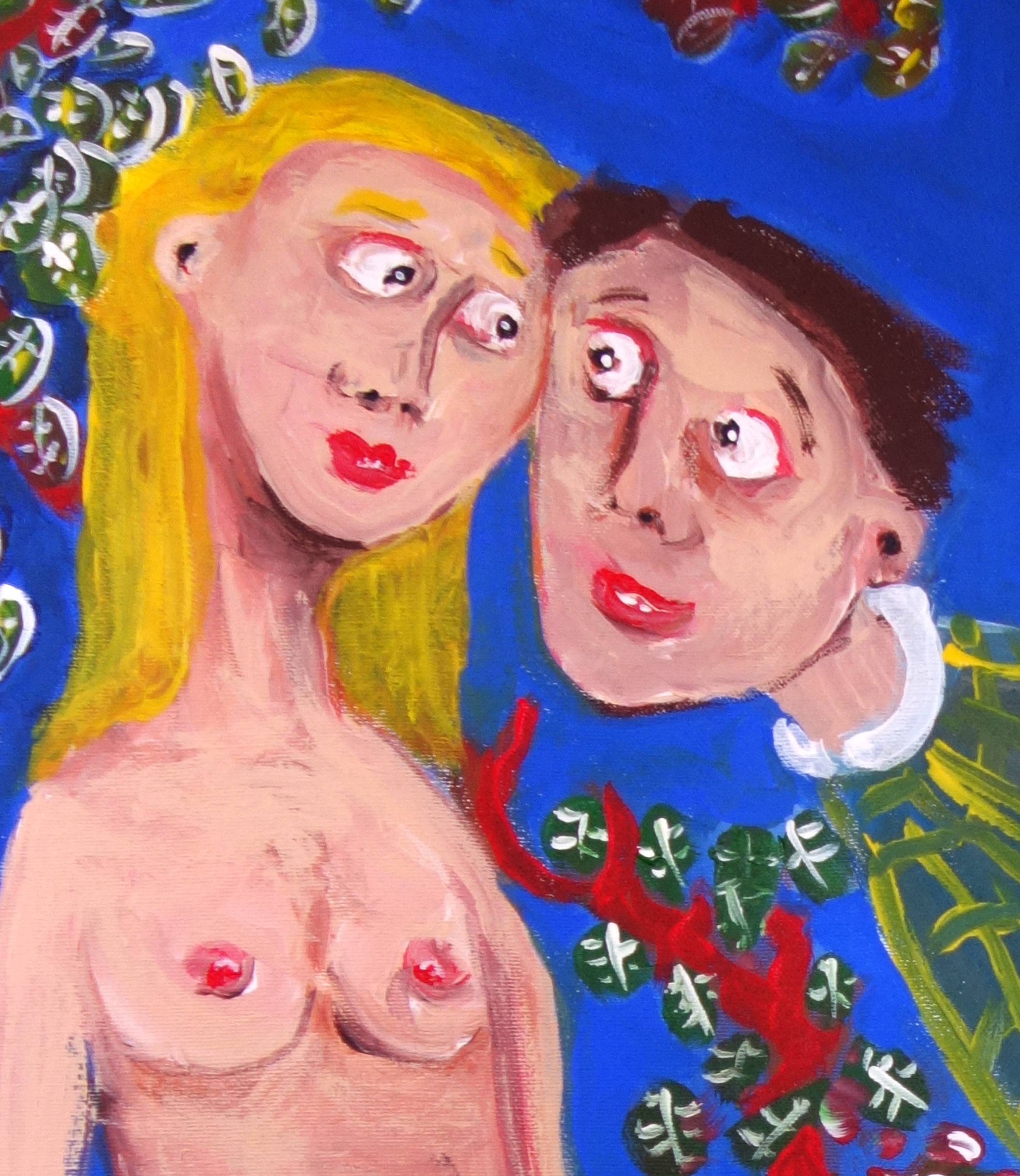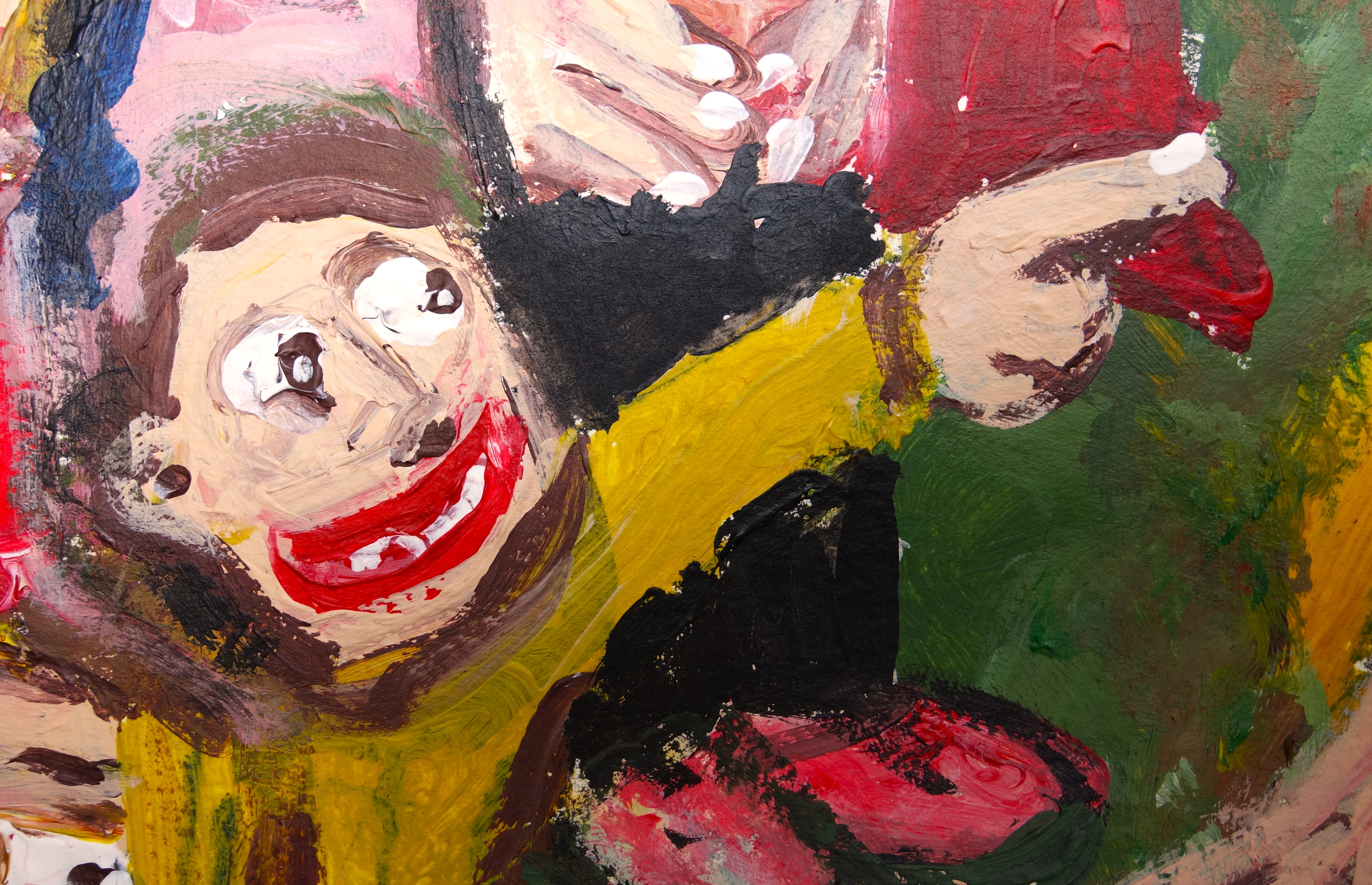 …/ s’organisaient tous les soirs des apéros très arrosés. Ce soir-là, tout en se marrant, le cochon ne pouvait pas s’empêcher de se questionner : À quel moment ces deux abrutis allaient ils comprendre qu’il n’était qu’un cochon ? » (Acrylique sur papier, dim 20/20cm, photos détails et oeuvre)