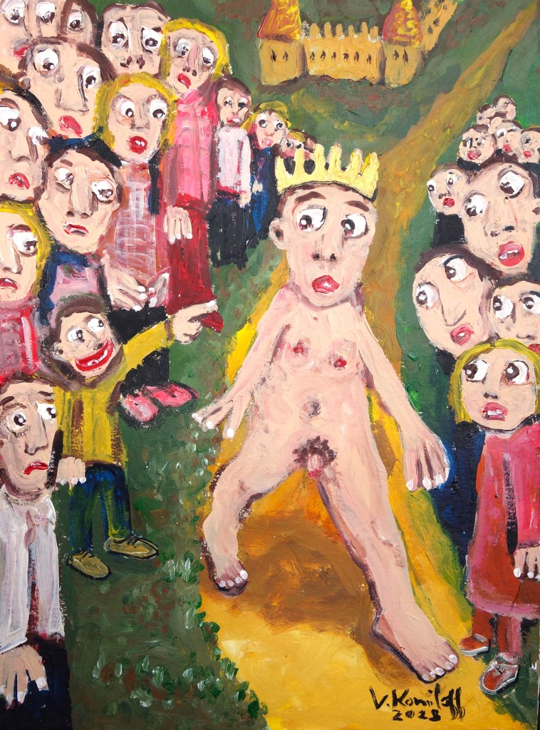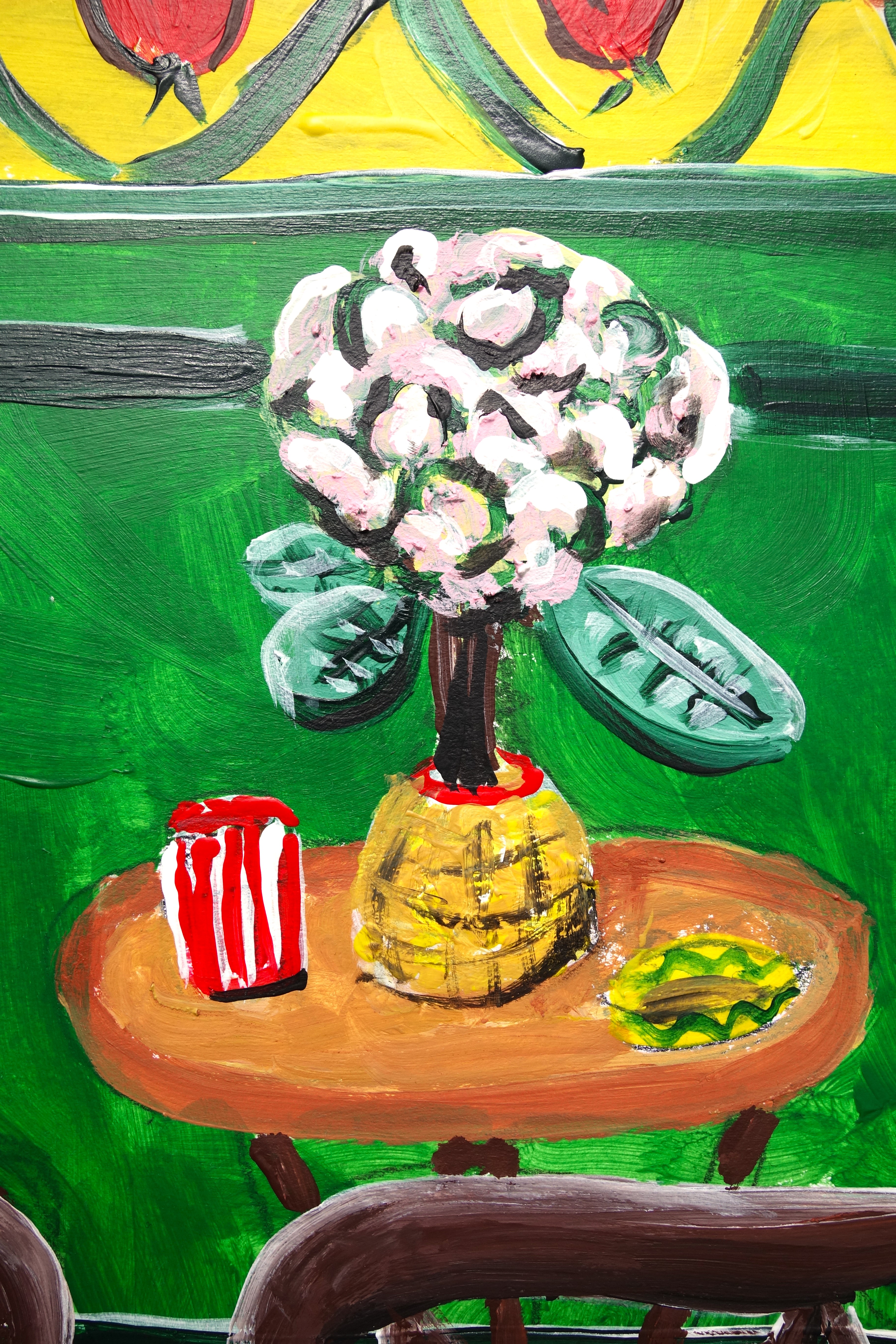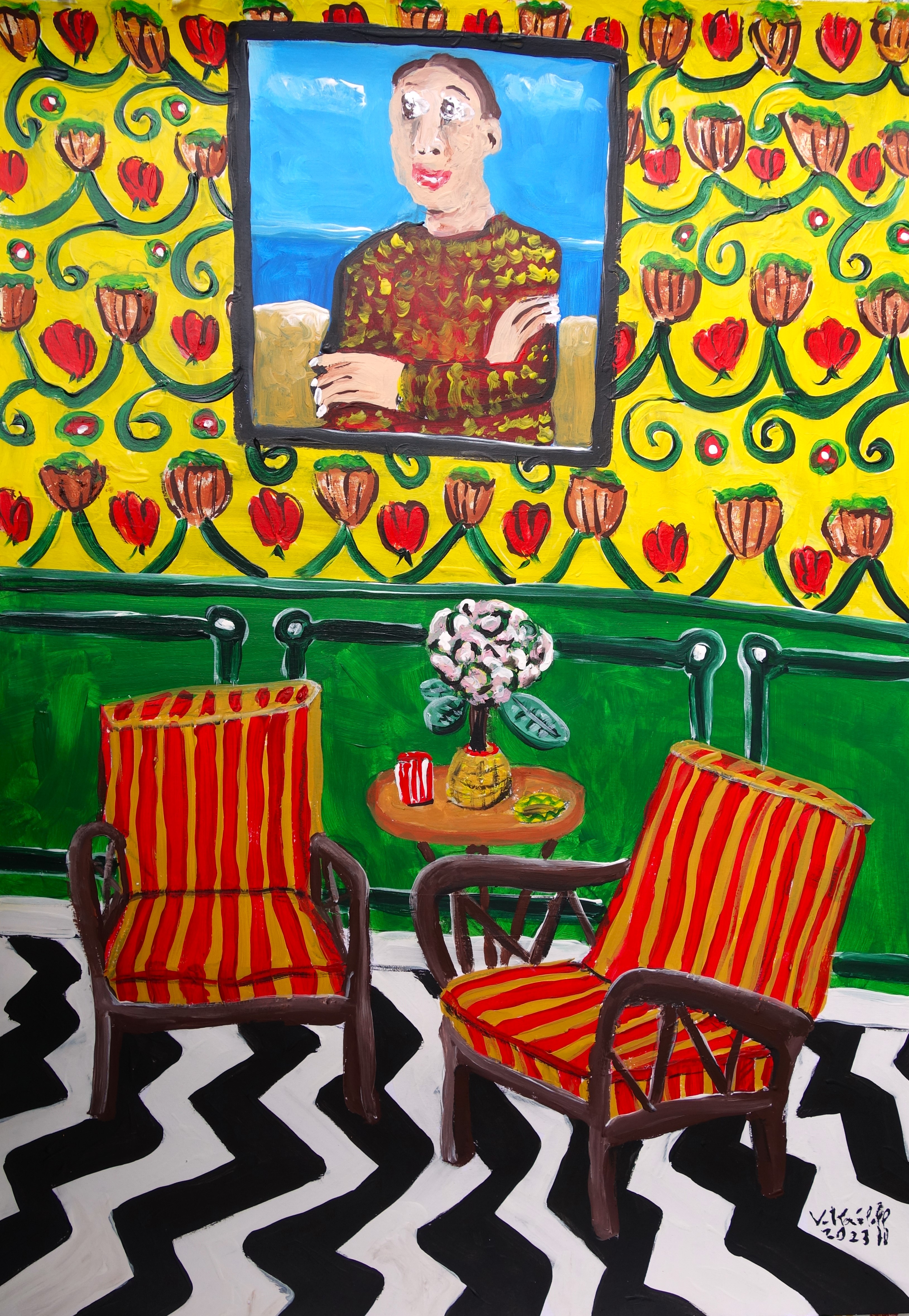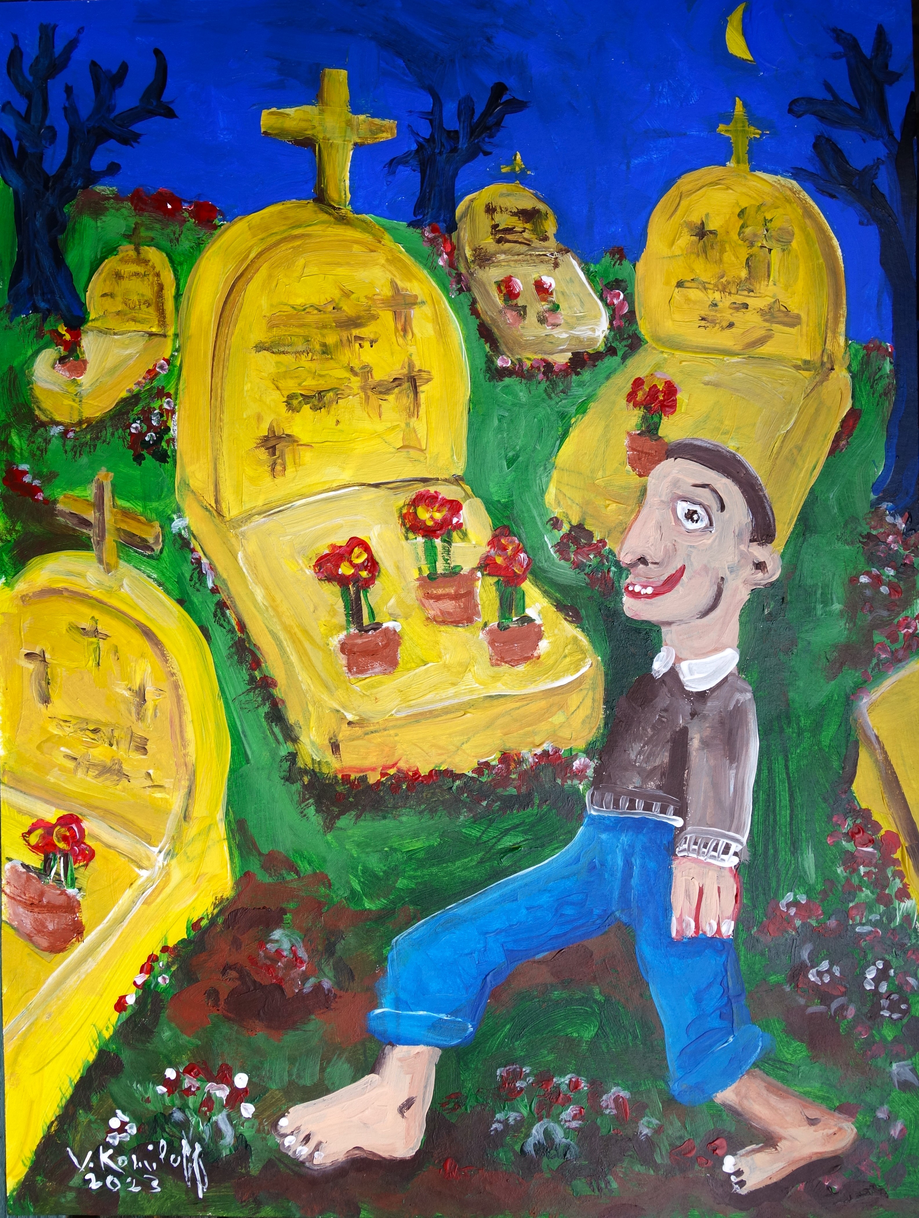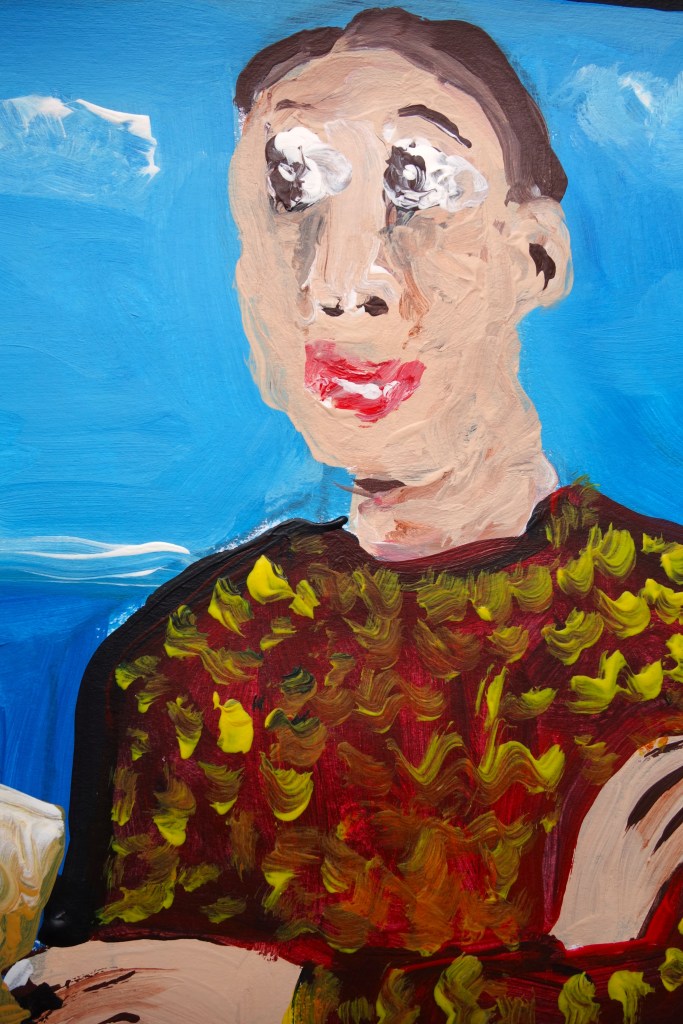 …/Jean-Michel racontait alors, tout en riant aux éclats, que ce jour-là, comme un con, il avait oublié ses lunettes de vue à l’hôtel. Ainsi il aimait particulièrement cette photo, elle incarnait l’anecdote la plus marrante de sa vie. Les invités se firent, encore, plus rares… » (Acryliques sur papier, dim.60/40cm)