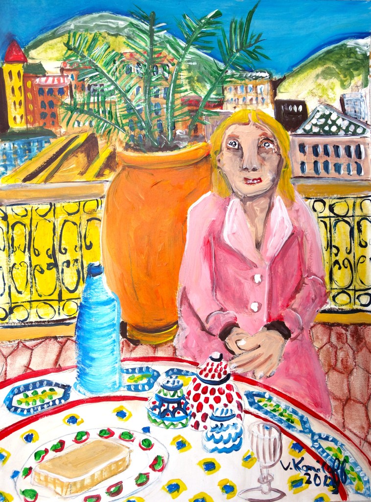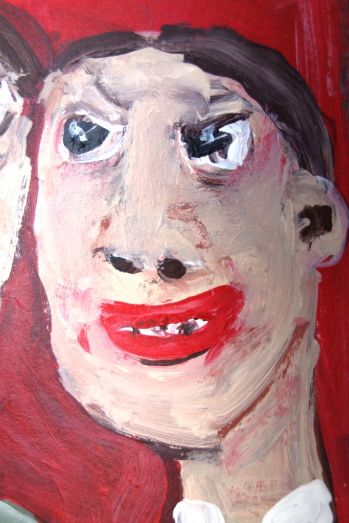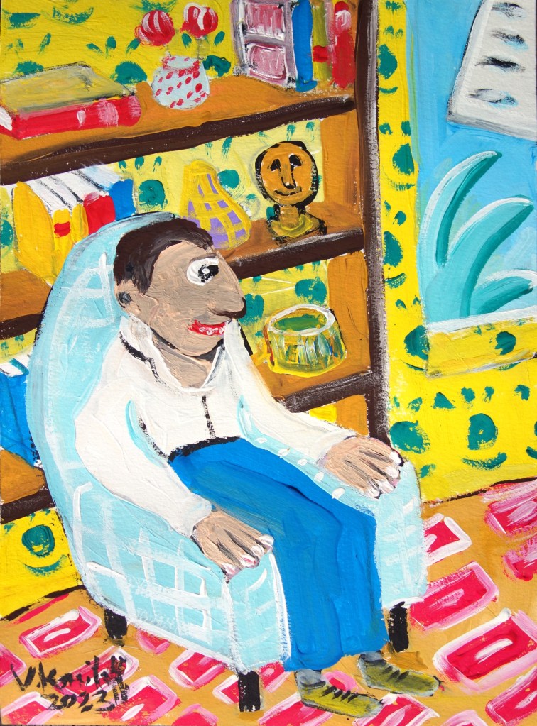 …/ Serait-il lui aussi victime de la féminisation galopante de la société ? Serait-ce la fin du patriarcat ? Souffrait il lui aussi de ce fameux mal de l’époque, la dysphorie de genre ? Toutes ces questions se bousculaient dans sa tête, et il resta prostré ainsi, sans pouvoir bouger, de très longues heures. (Acrylique sur toile, 70/50cm)