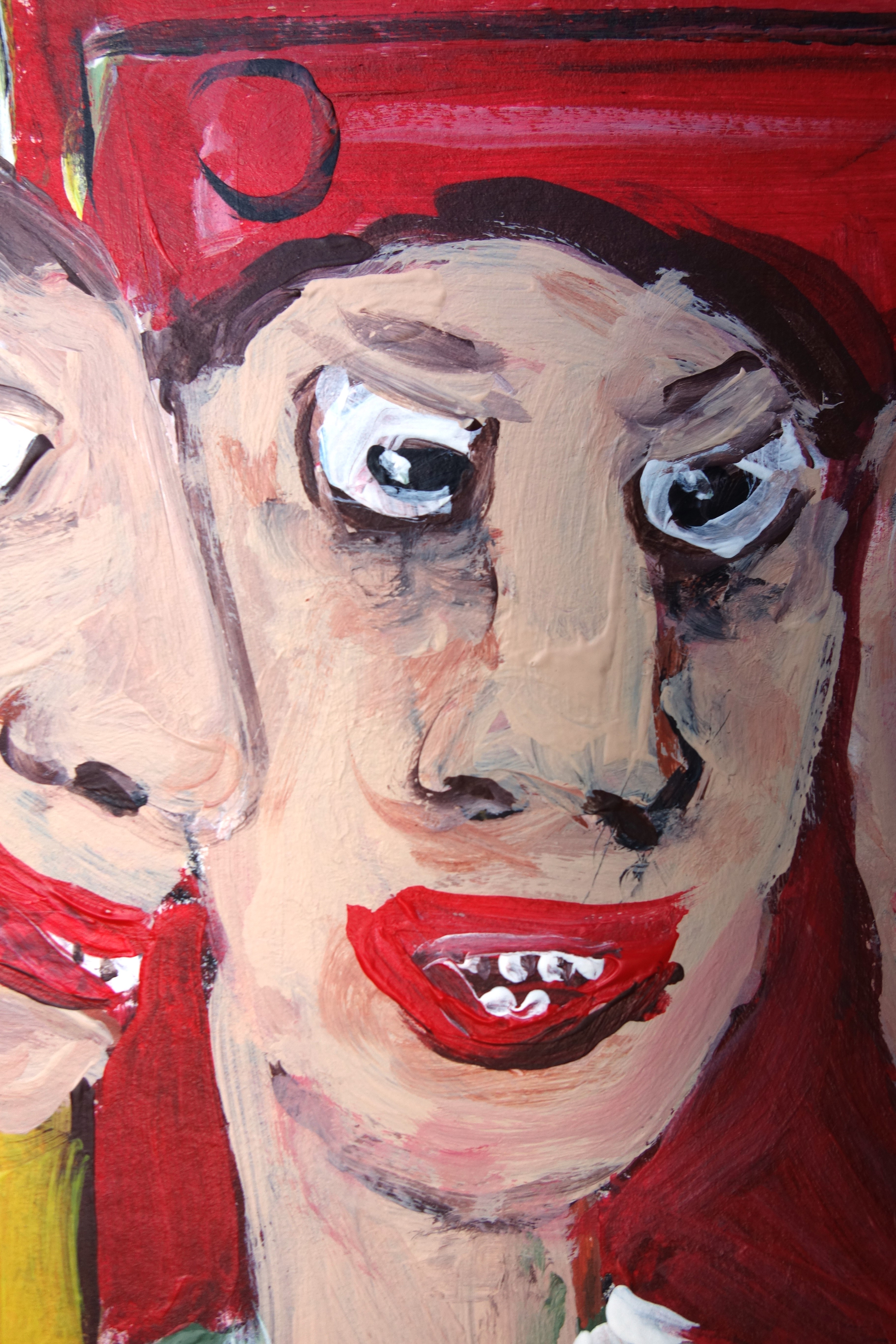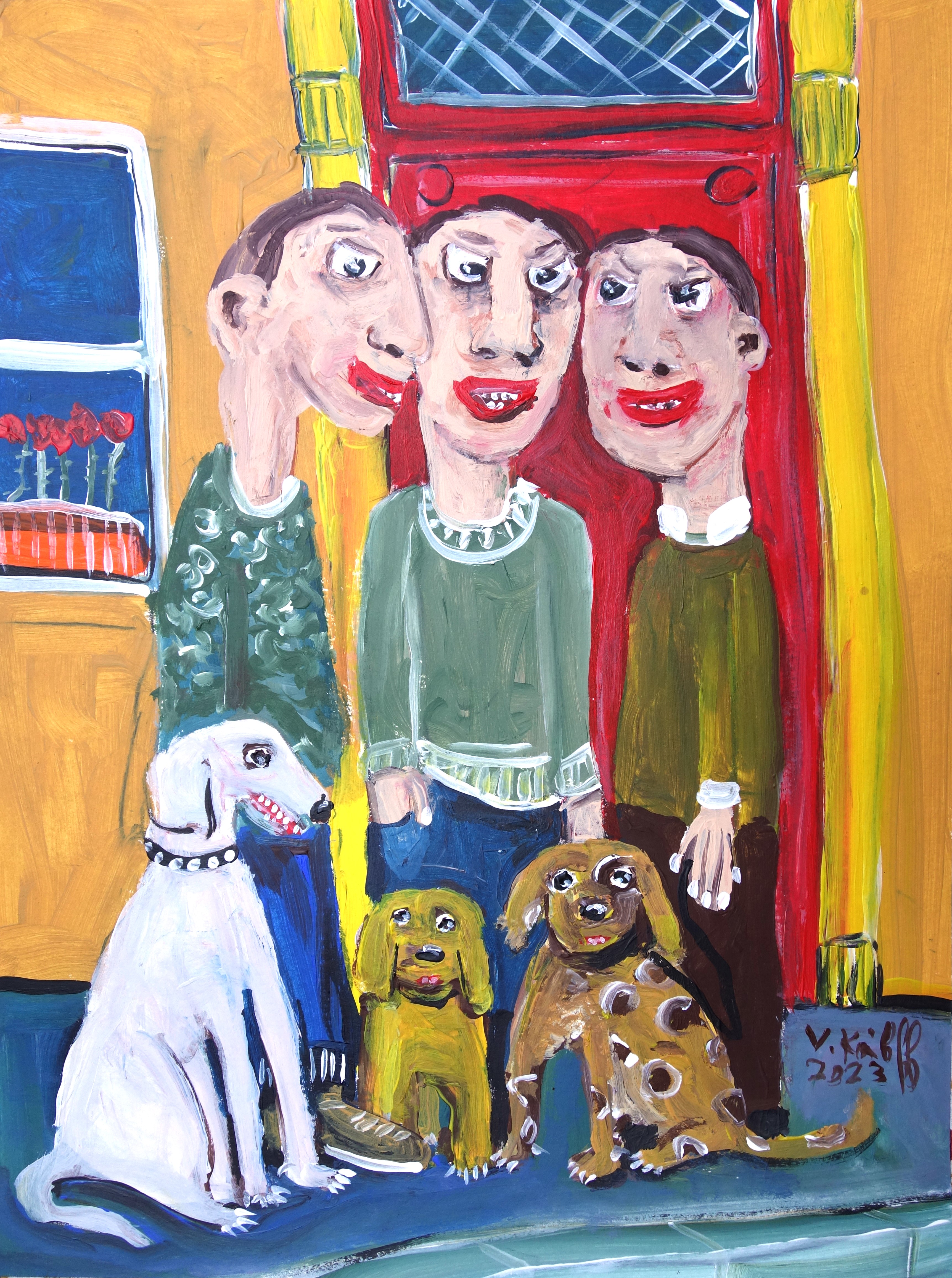 « …/Ils firent ainsi connaissance lors de leurs promenades quotidiennes. Depuis, tout le quartier avait sombré dans une ambiance délétère. En effet, Kevin, Jordan et Hugo se révélaient être, lorsqu’ils se trouvaient ensemble, de véritables langues de putes. Tous les habitants du quartier en faisaient tous les jours les frais. »(acrylique sur papier, 40/30cm)