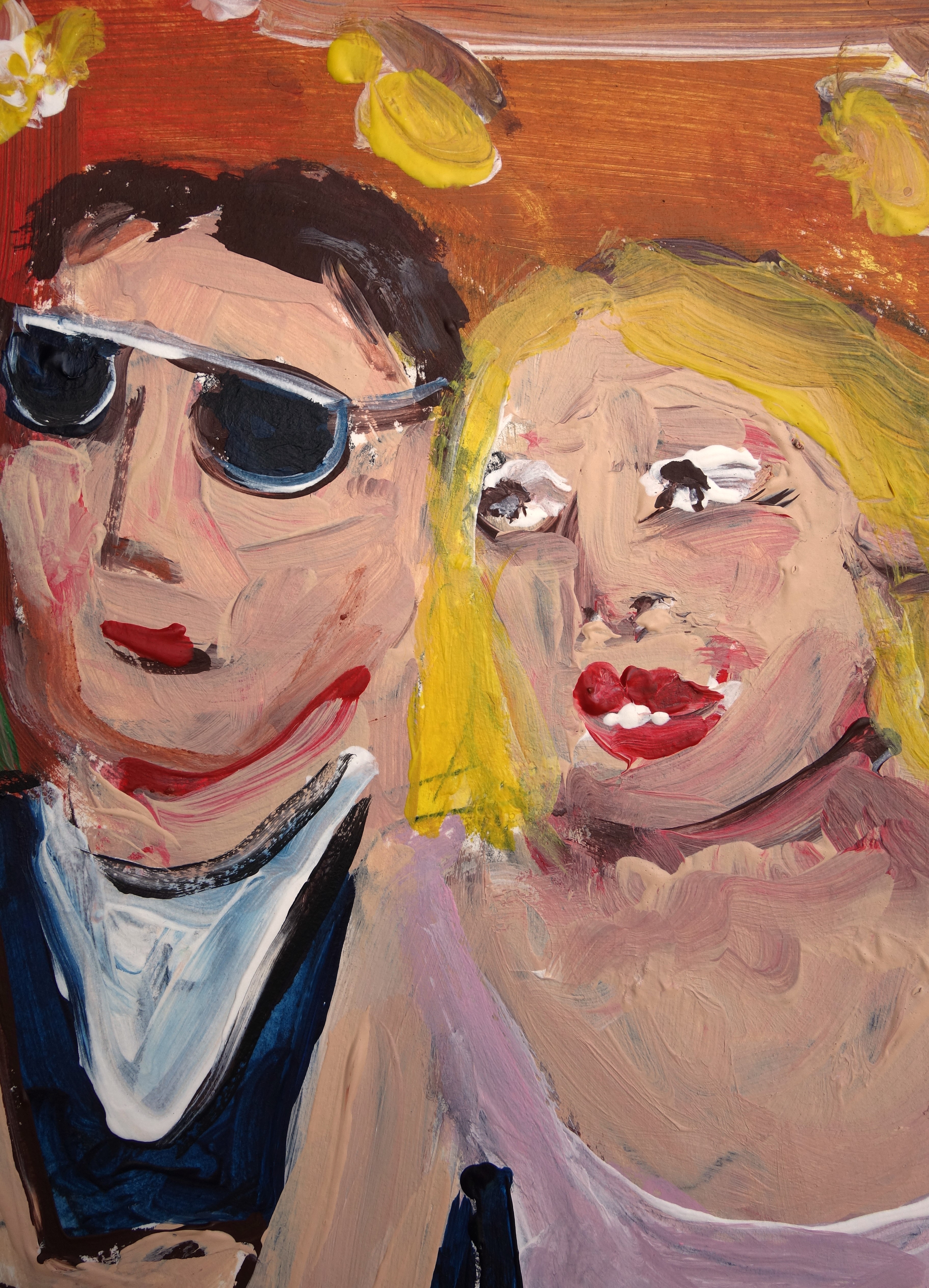 …/ Après 25 années laborieuses de mariage, elle lui avoua qu’elle aussi, elle n’aurait définitivement plus la force de supporter ce con plus longtemps. Bertrand, un peu gêné, lui expliqua alors qu’il parlait de son boulot. (Gouache sur papier, diptyque 2X 30/20cm.)