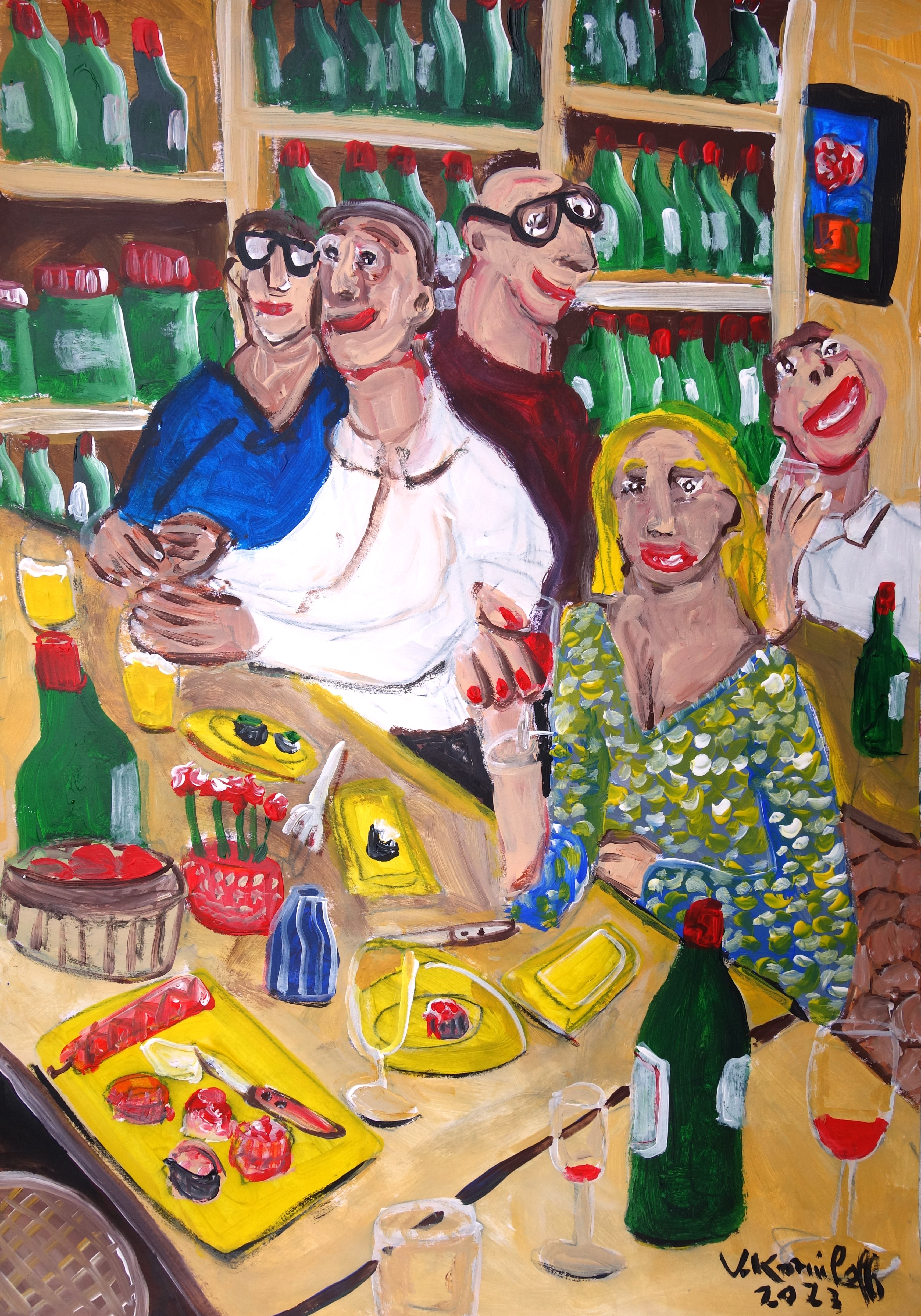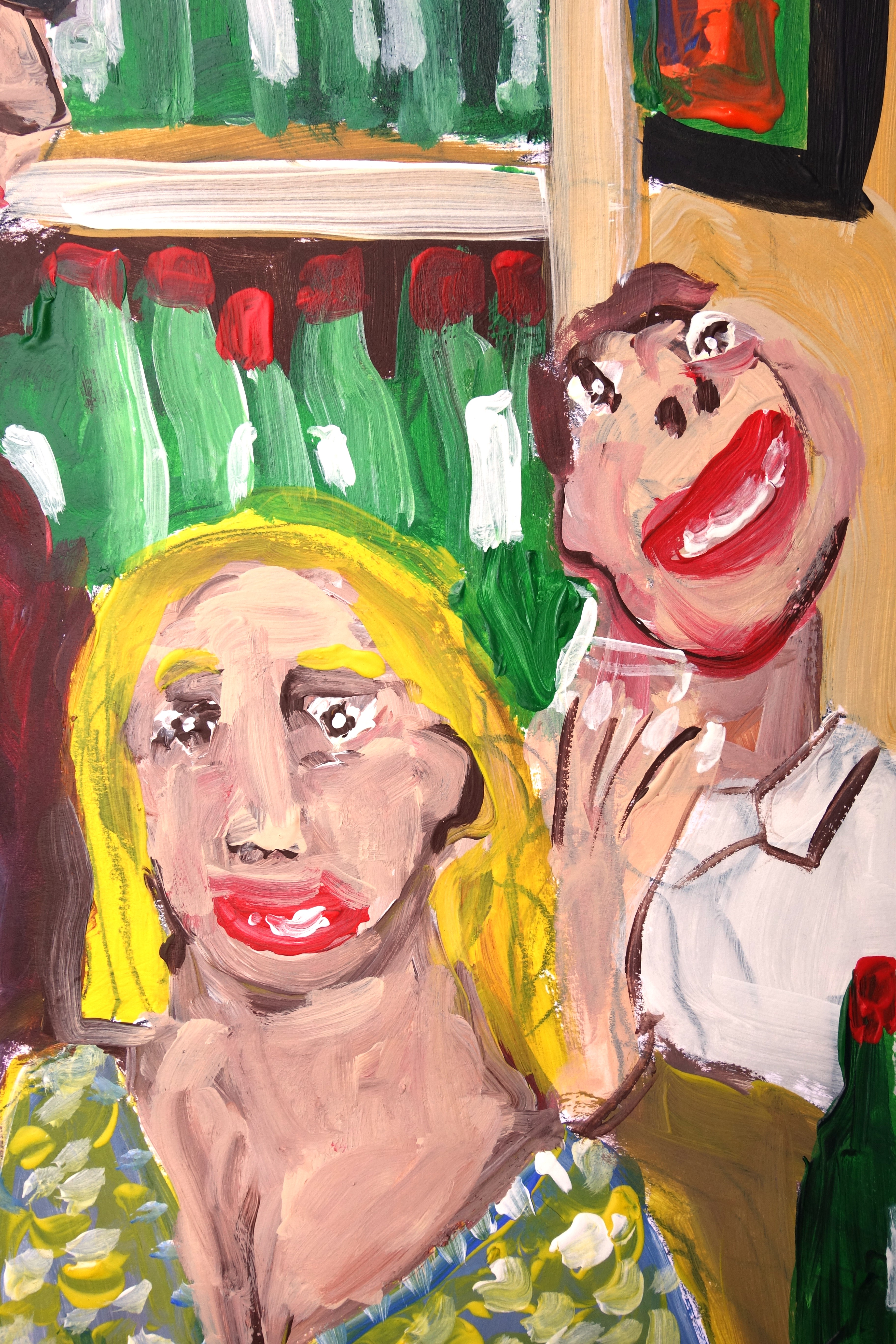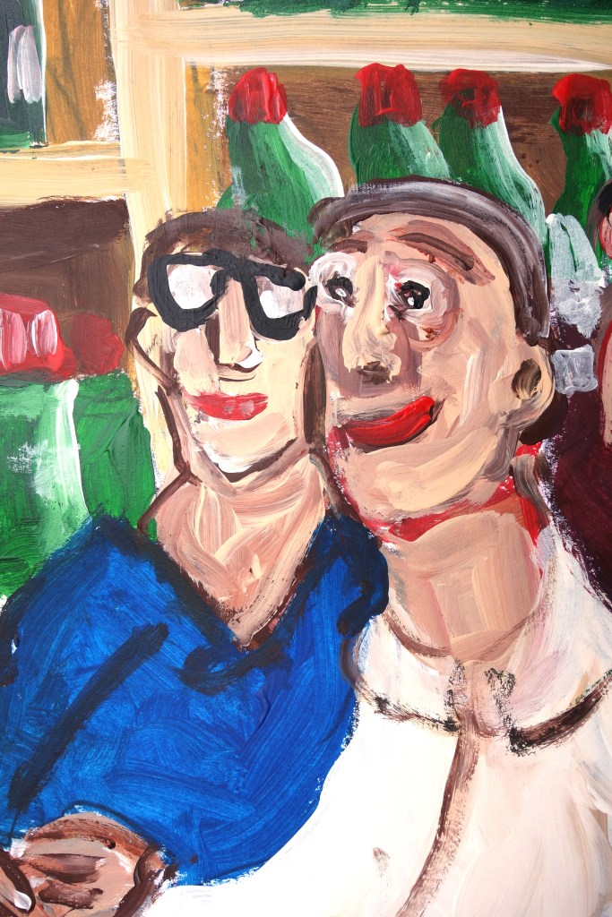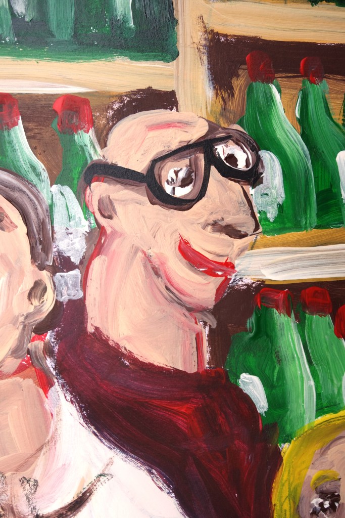 « Ce soir-là chez Castel, quand Jean-Bernard annonça qu’il allait voter pour le candidat socialiste, personne ne l’avait pris vraiment au sérieux. Plus tard dans la soirée, ses amis ont compris que ce n’était pas une plaisanterie. En effet, Jean-Bernard partit sans payer… »(Acrylique sur papier, 40/30cm)