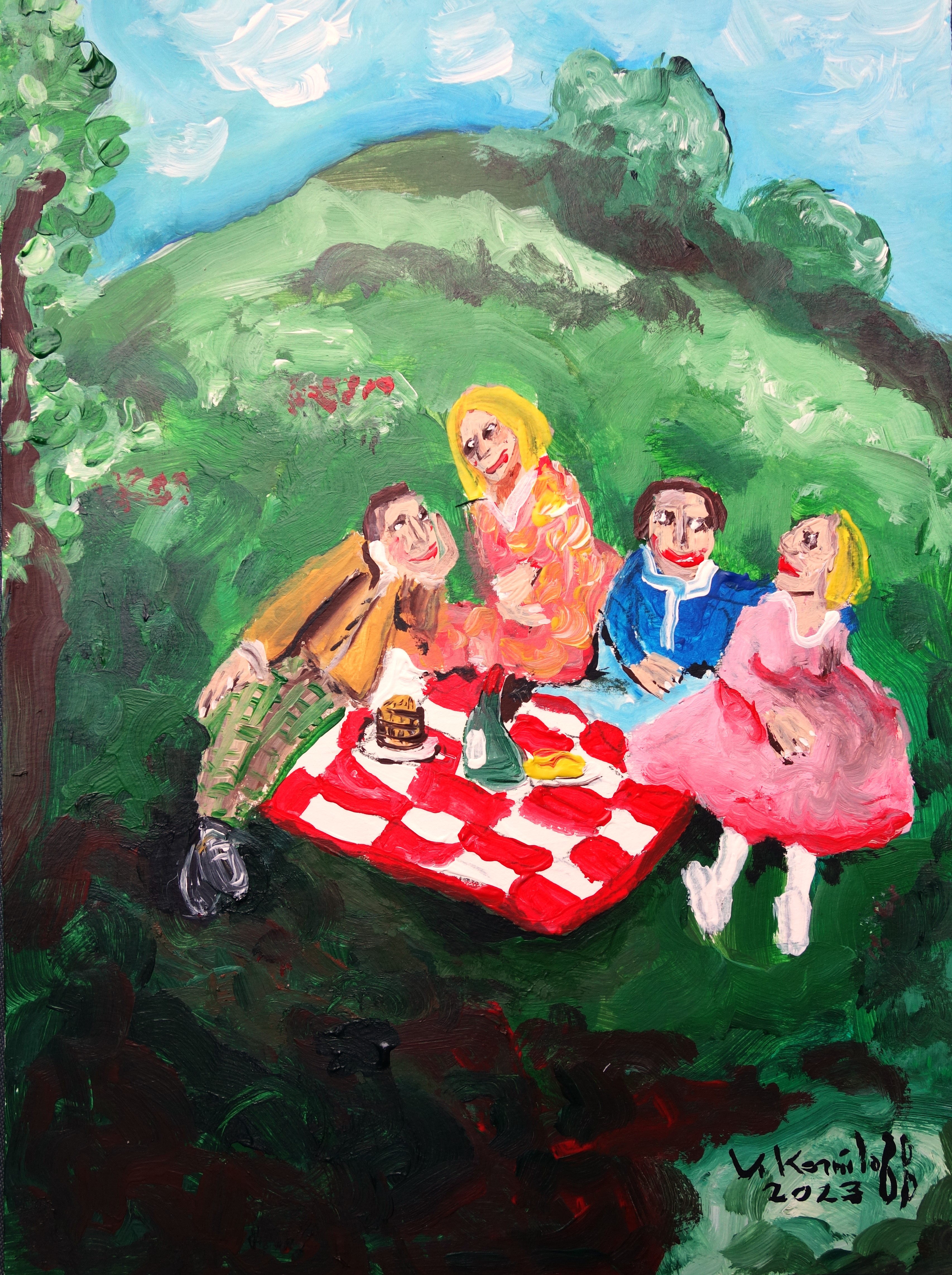 « …/ — Je voudrais être petit chien ! — Embrassons nos bergères, l’une Après l’autre. — Messieurs, eh bien ? — Do, mi, sol. — Hé ! bonsoir la Lune ! » (« Sur l’herbe », Verlaine, extrait), acrylique sur papier, 30/20cm.