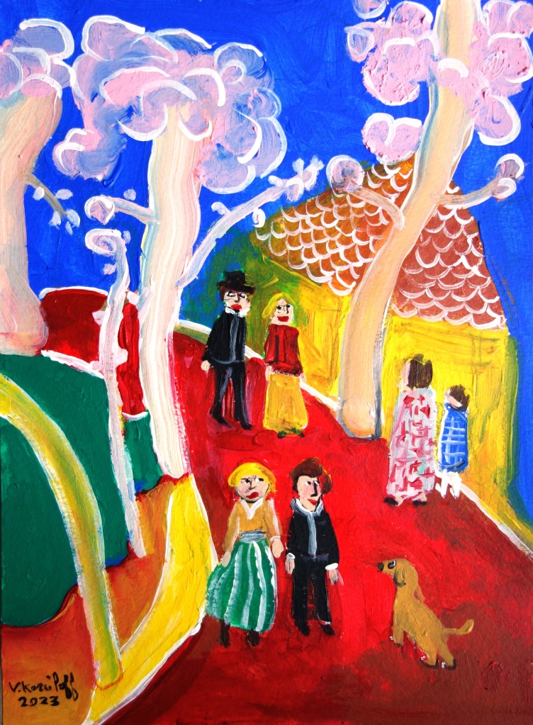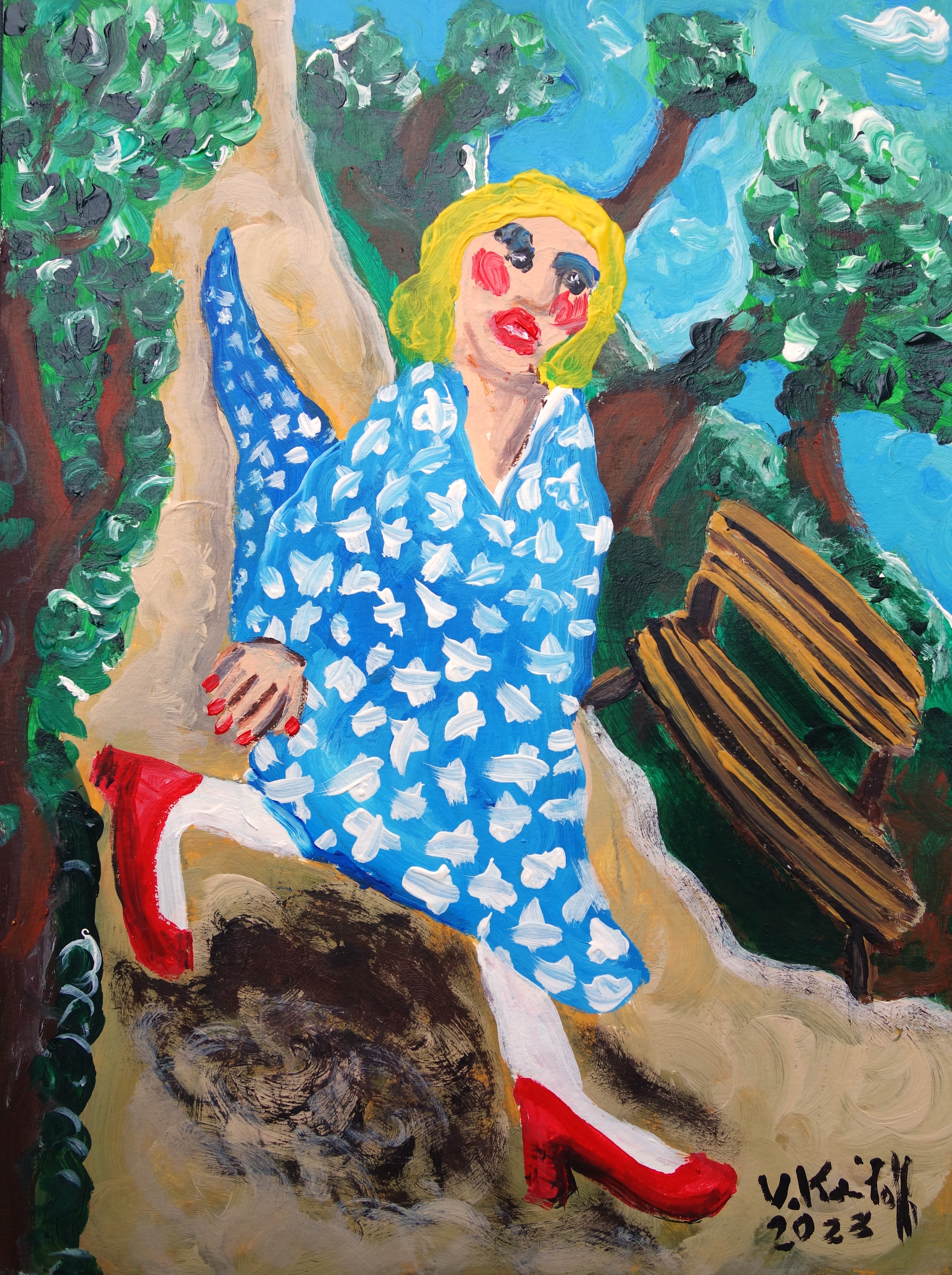 « Fardée et peinte comme au temps des bergeries Frêle parmi les noeuds énormes de rubans, Elle passe sous les ramures assombries, Dans l’allée où verdit la mousse des vieux bancs, /… » (L’allée », Verlaine, extrait), acrylique sur papier, 30/20cm.