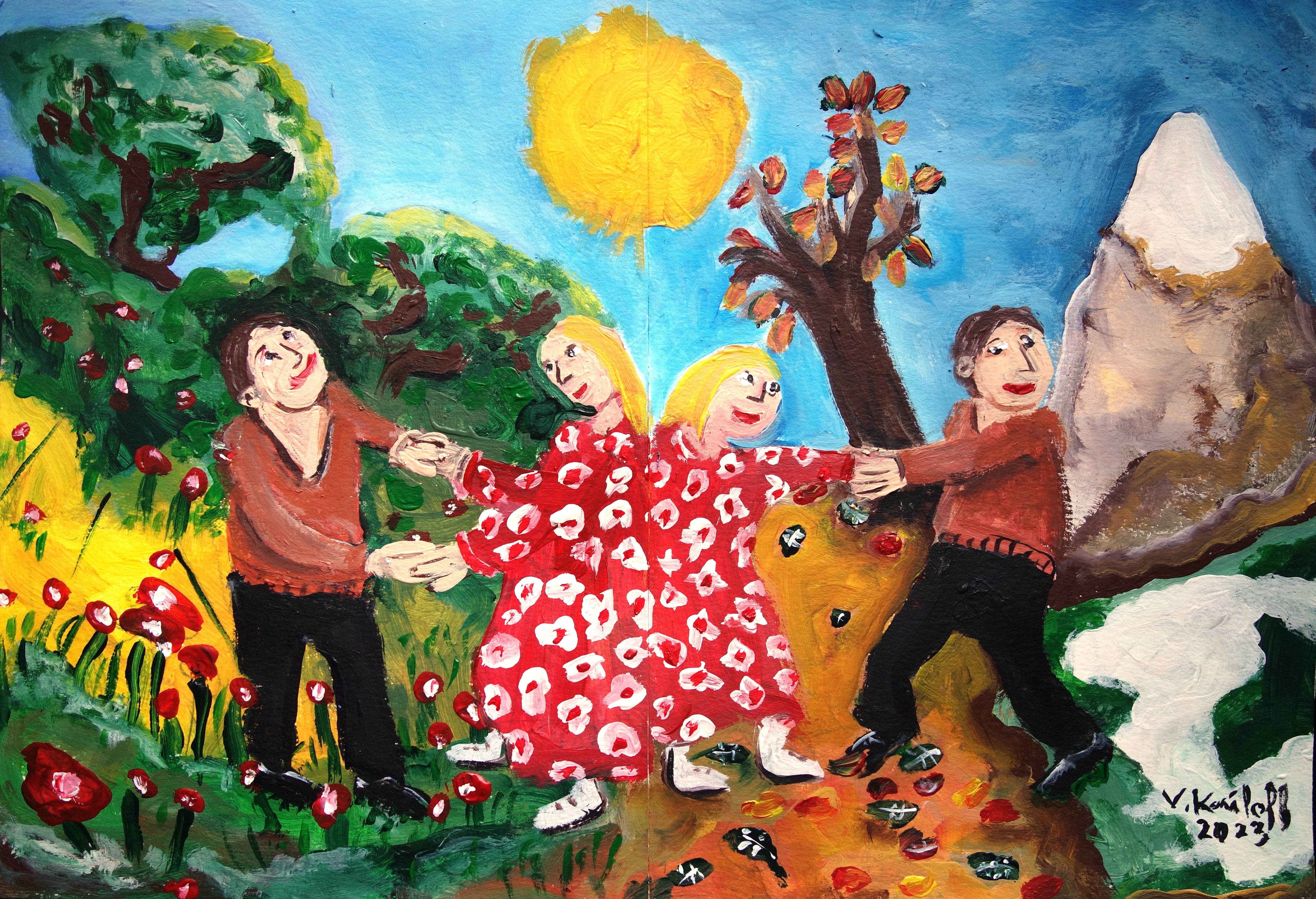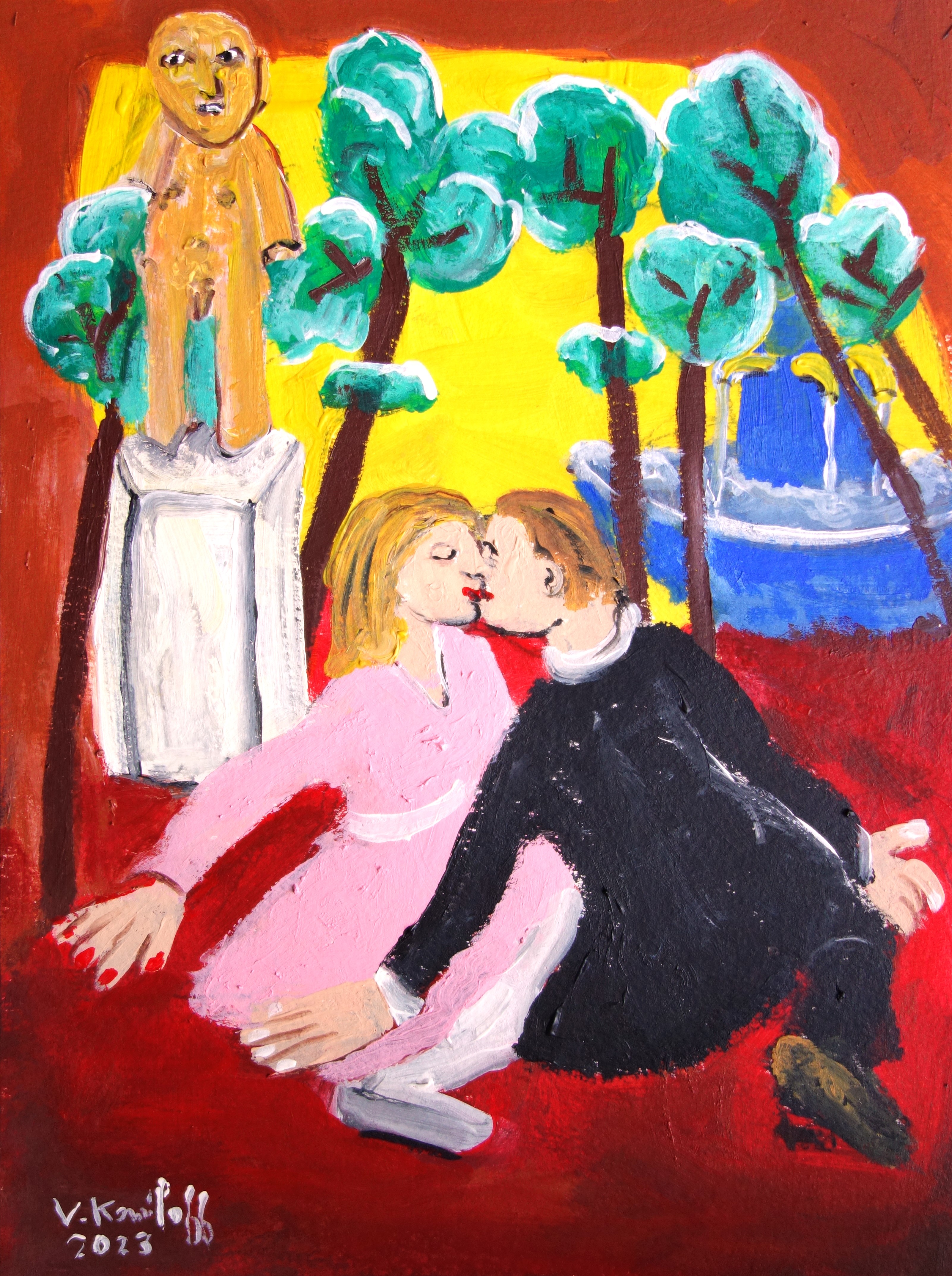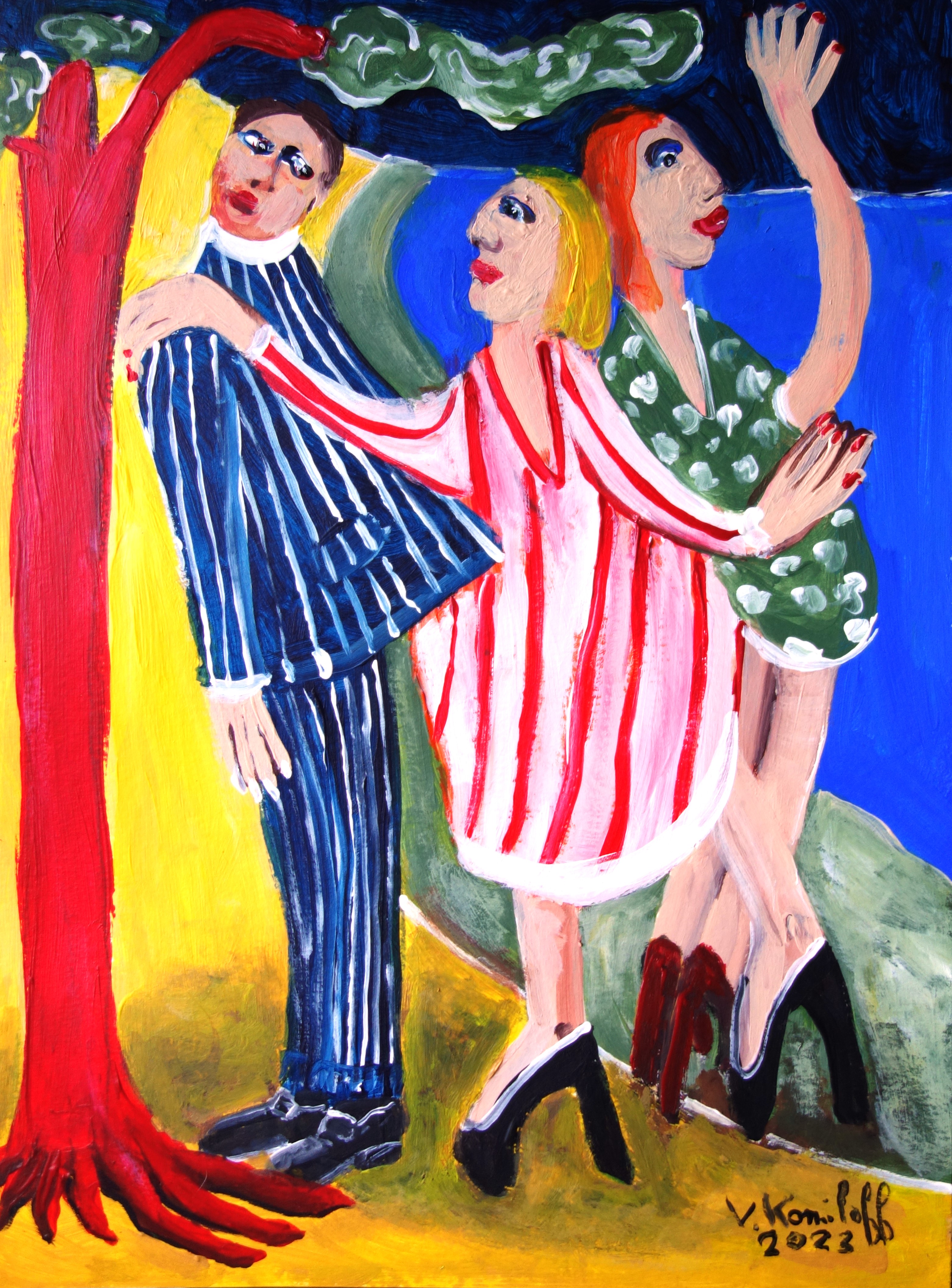 « Les hauts talons luttaient avec les longues jupes, En sorte que, selon le terrain et le vent, Parfois luisaient des bas de jambes, trop souvent Interceptés ! – et nous aimions ce jeu de dupes./… » « Les ingénus« , Verlaine, extrait, acrylique sur toile, 30/20cm.