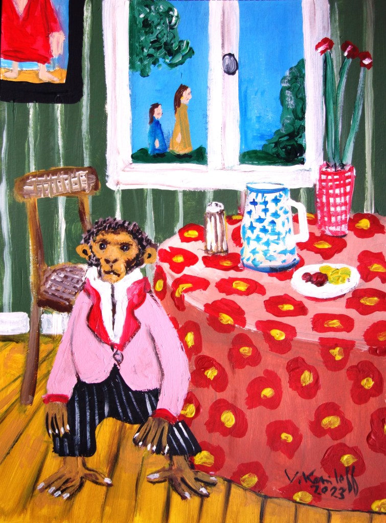 « Un singe en veste de brocart Trotte et gambade devant elle Qui froisse un mouchoir de dentelle Dans sa main gantée avec art,/… » « Cortège« , Verlaine, extrait), acrylique sur papier, 30/20cm.