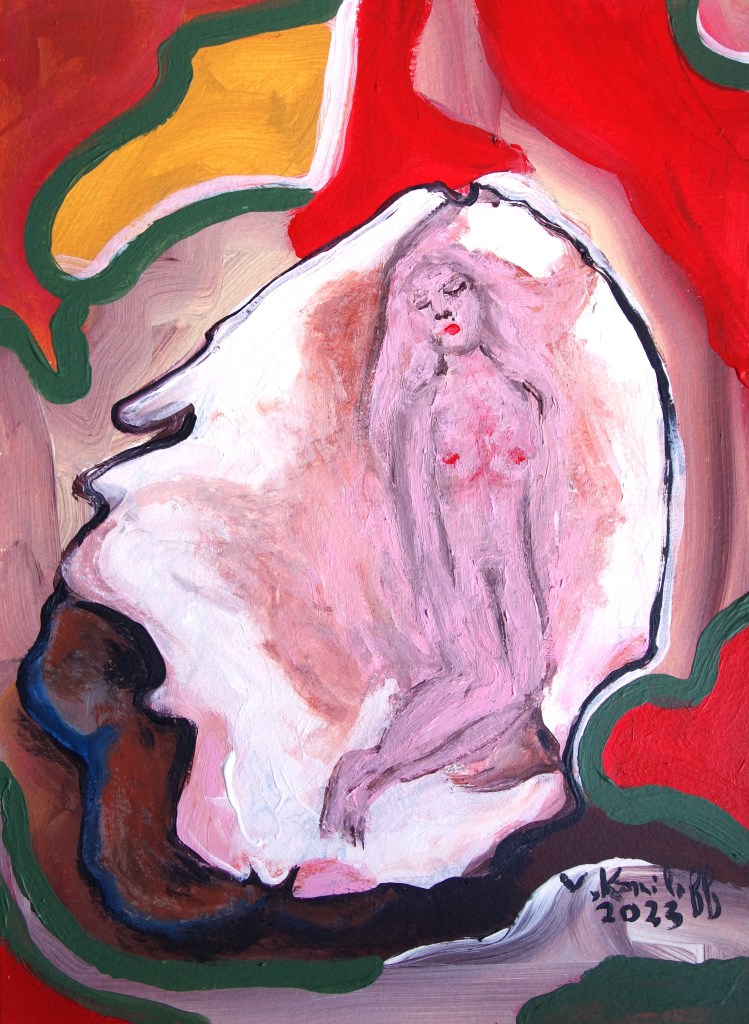 « Chaque coquillage incrusté Dans la grotte où nous nous aimâmes A sa particularité/… …/Mais un, entre autres, me troubla.« (« Les coquillages« , Verlaine, extraits choisis), acrylique sur papier, 30/20cm.