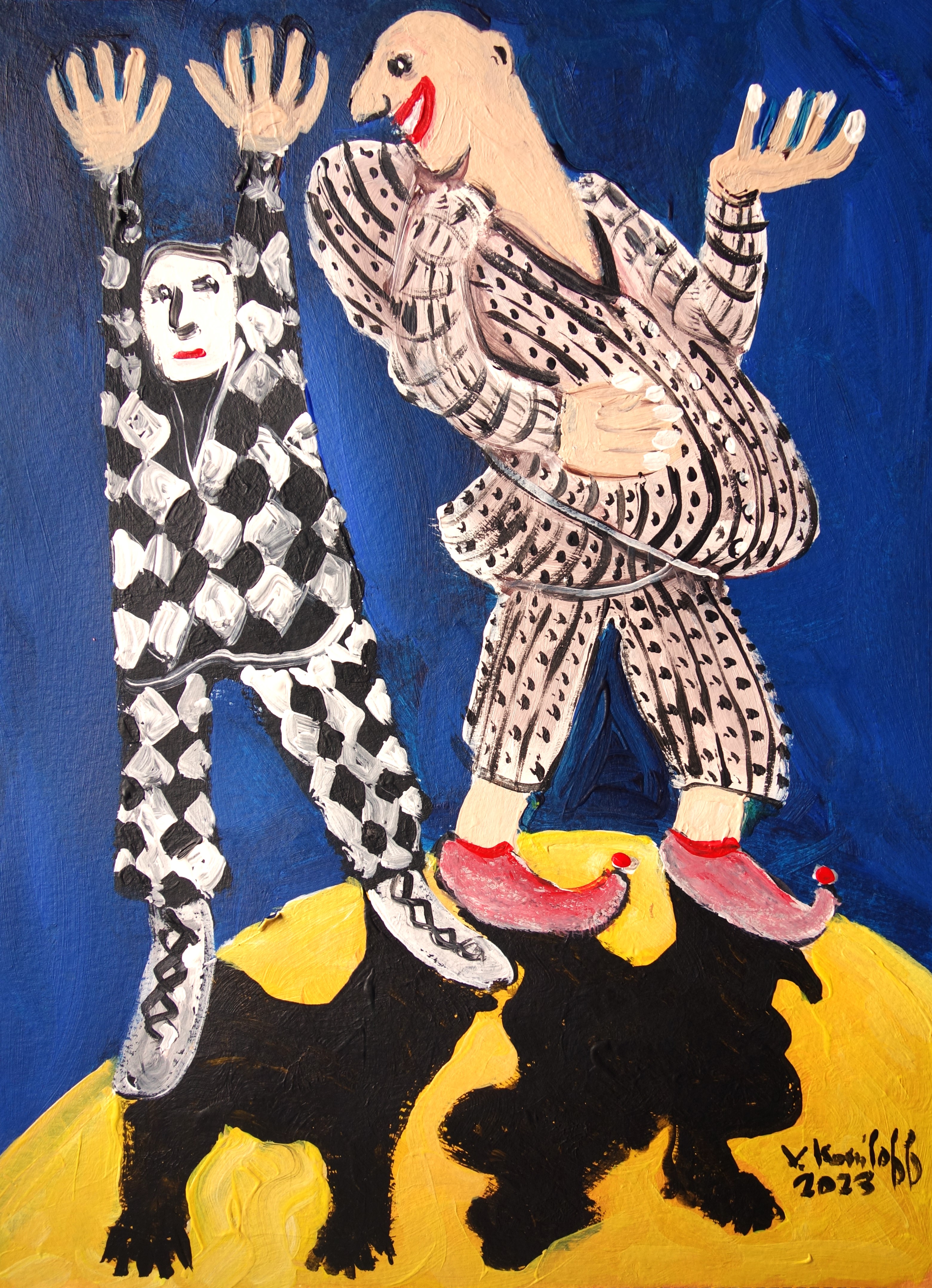 « Pierrot, qui n’a rien d’un Clitandre , Vide un flacon sans plus attendre. Et, pratique, entame un pâté./… » (Verlaine, « Pantomime », extrait), acrylique sur papier, 30/20cm.