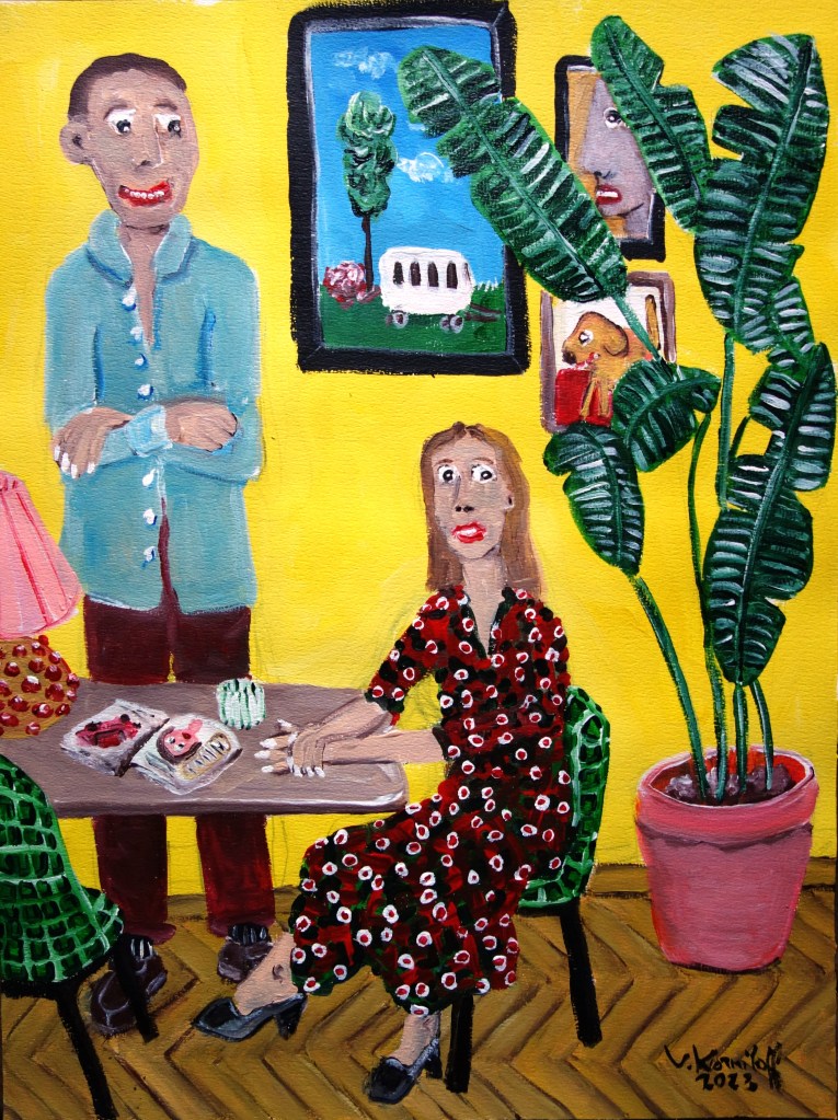 …/ ce bistrot dans l’espoir de rencontrer le grand amour. Puis un soir, celui-ci fit son apparition. Patricia et Jennifer, complètement bourrées, ne l’ont jamais remarqué. » (Acrylique sur papier, 40/30cm.)