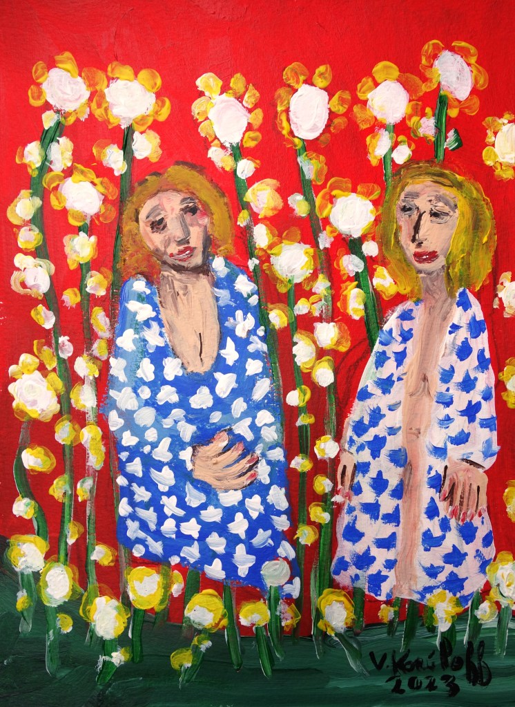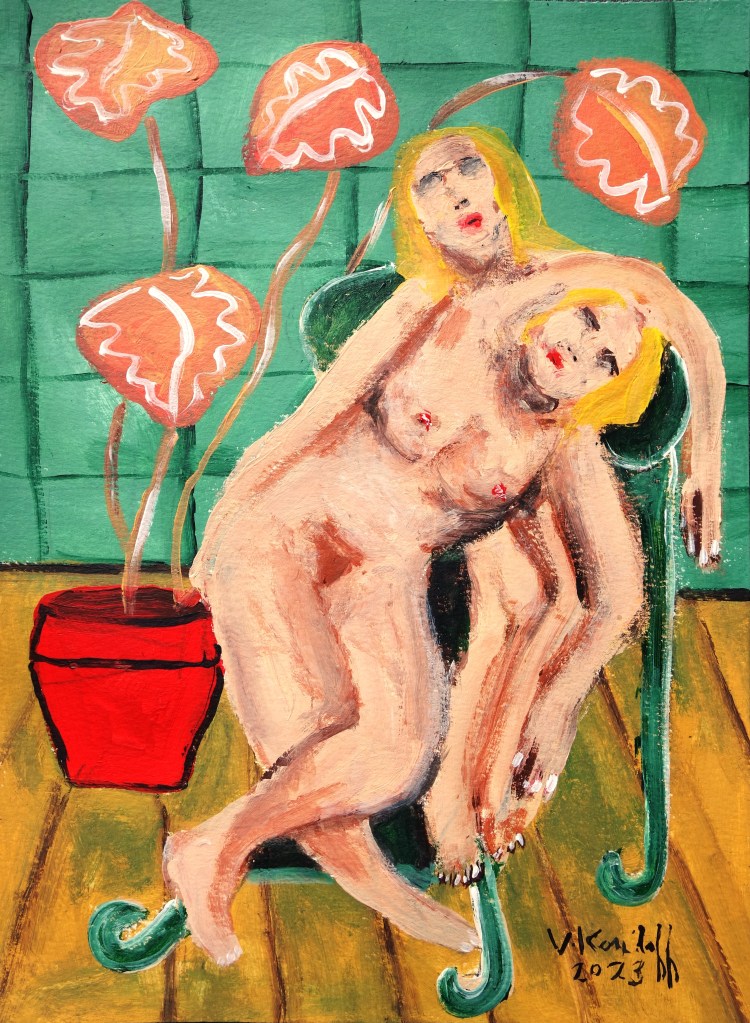 « …/Toutes deux dormaient dans la même chambre ; C’était par un soir lourd de septembre ; /… » (Verlaine, extrait « Pensionnaires »), acrylique sur papier, 30/20cm