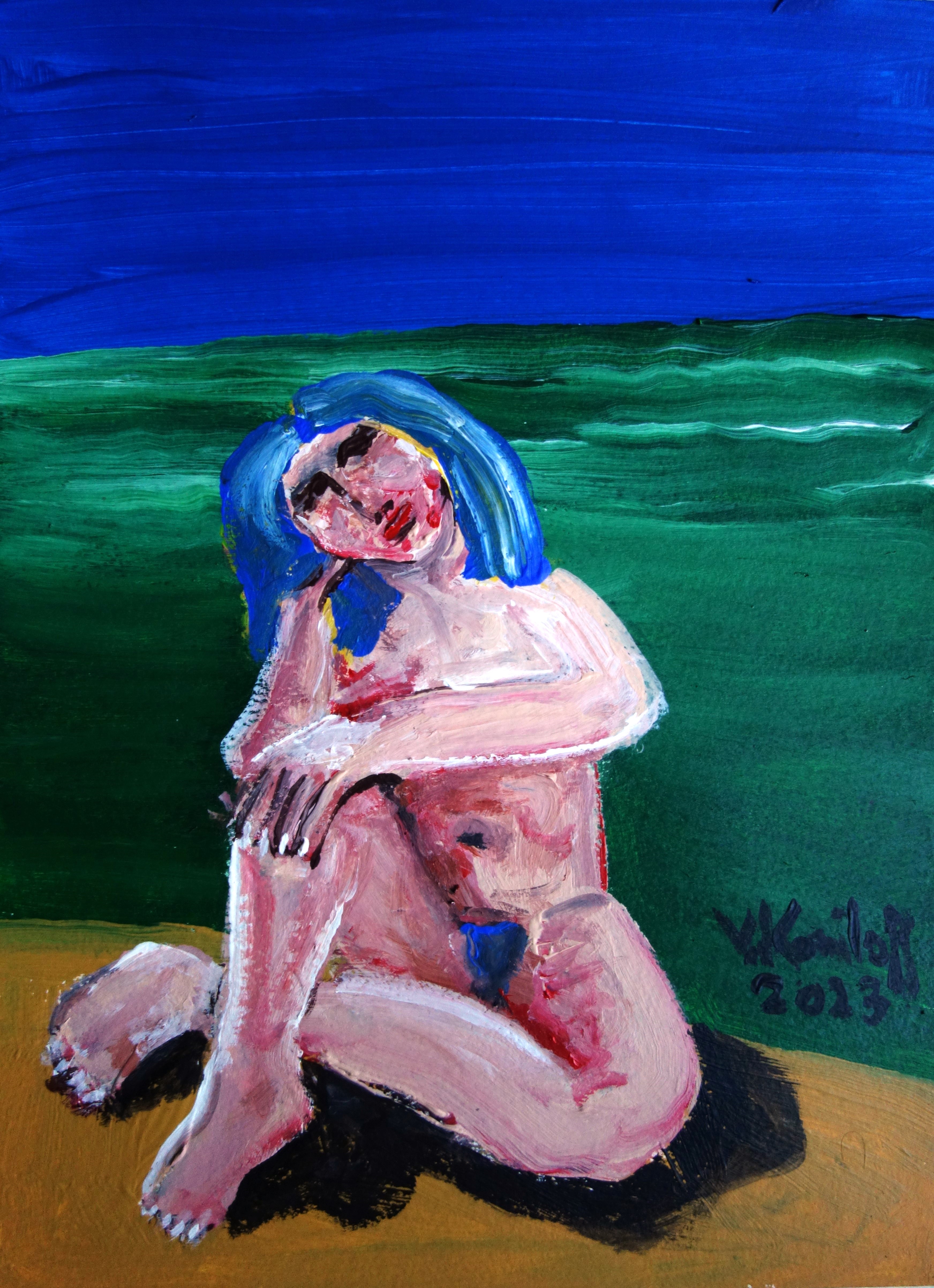 « Furieuse, les yeux caves et les seins roides, Sappho, que la langueur de son désir irrite, Comme une louve court le long des grèves froides. /… » (Verlaine, « Sappho », extrait), acrylique sur papier, 30/20.