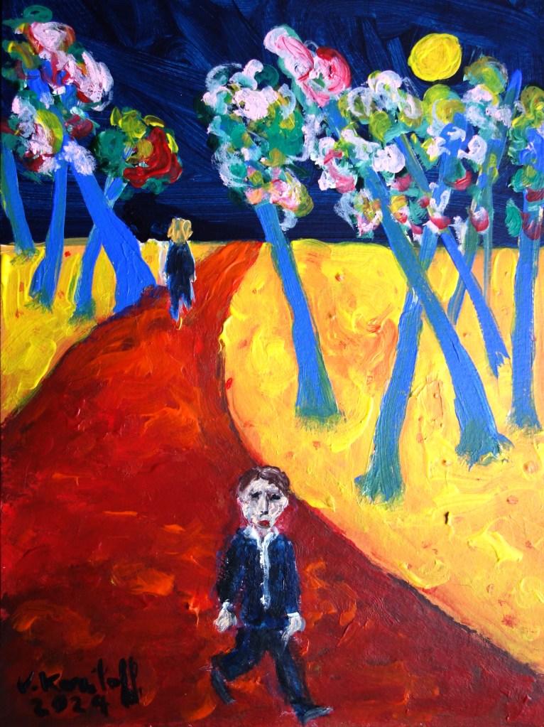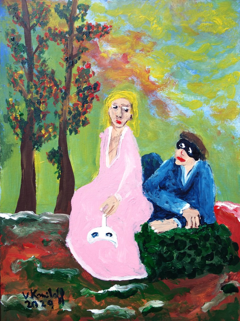 « Dans le vieux parc solitaire et glacé, Deux formes ont tout à l’heure passé. Leurs yeux sont morts et leurs lèvres sont molles, Et l’on entend à peine leurs paroles./… » (« Colloque sentimental », Verlaine, extrait.) « Colloque sentimental », acrylique sur papier, 30/20cm.