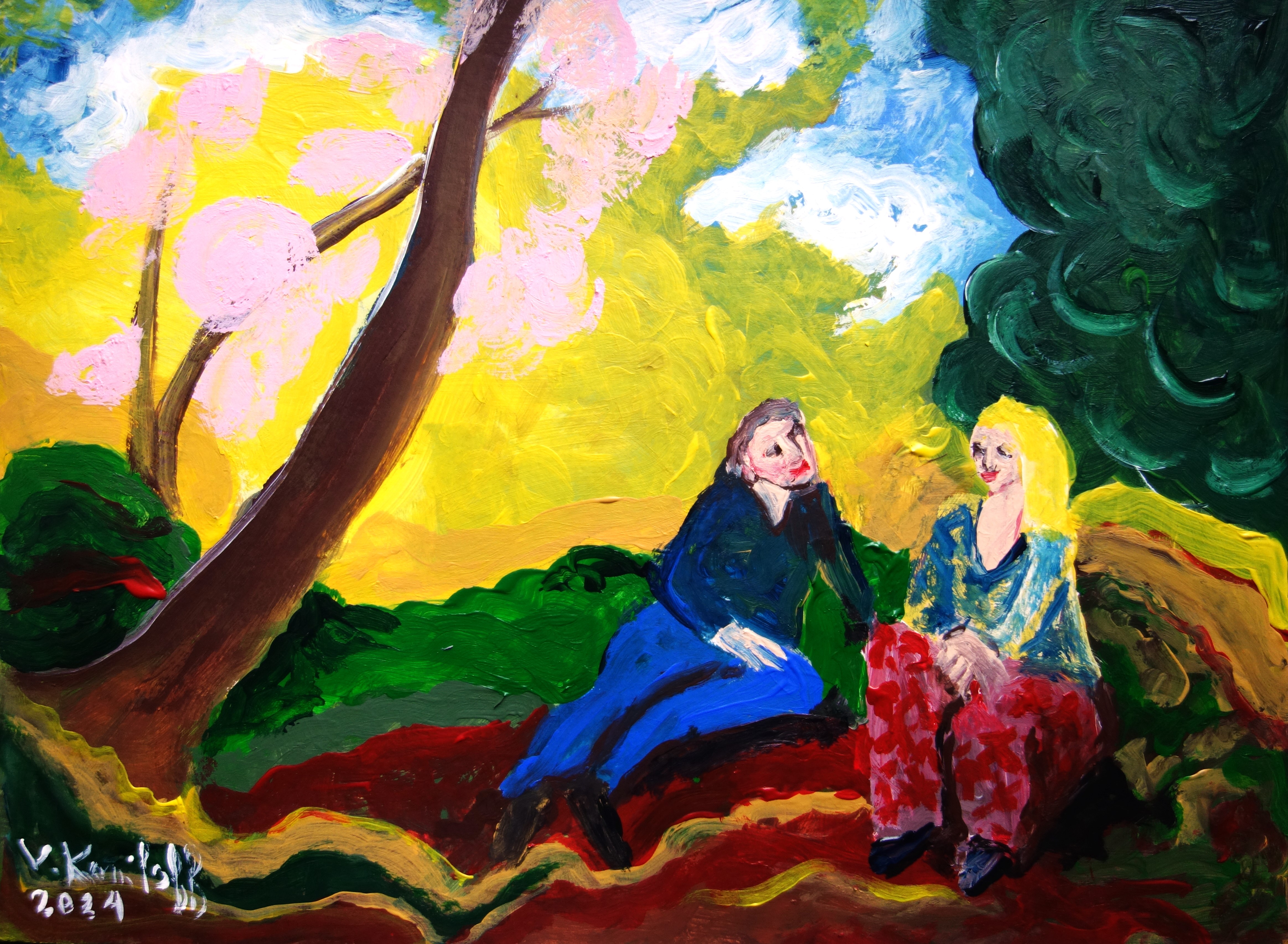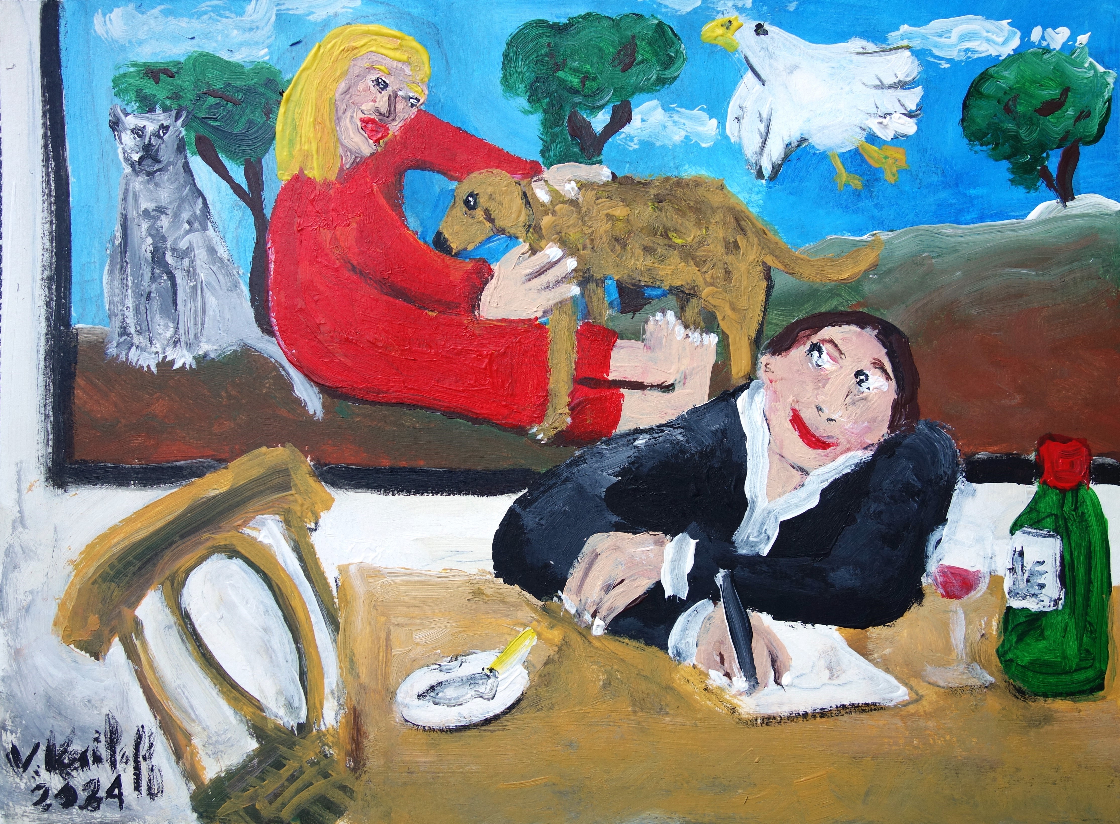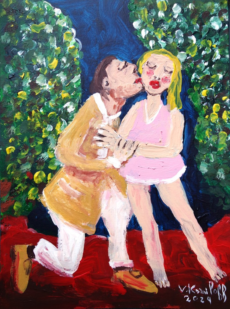 « Bah ! malgré les destins jaloux, Mourons ensemble, voulez-vous ? – La proposition est rare. – Le rare est bon. Donc mourons Comme dans les Décamérons. – Hi ! Hi ! Hi ! quel amant bizarre ! /… » (« Les indolents », Verlaine, extrait) « Les Indolents », acrylique sur papier, 30/20cm.