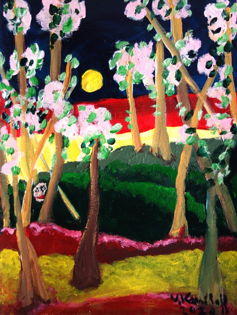 « ../Tourbillonnent dans l’extase D’une lune rose et grise, Et la mandoline jase Parmi les frissons de brise.« (« Mandoline », Verlaine, extrait). « Mandoline », acrylique sur papier, 30/20cm.