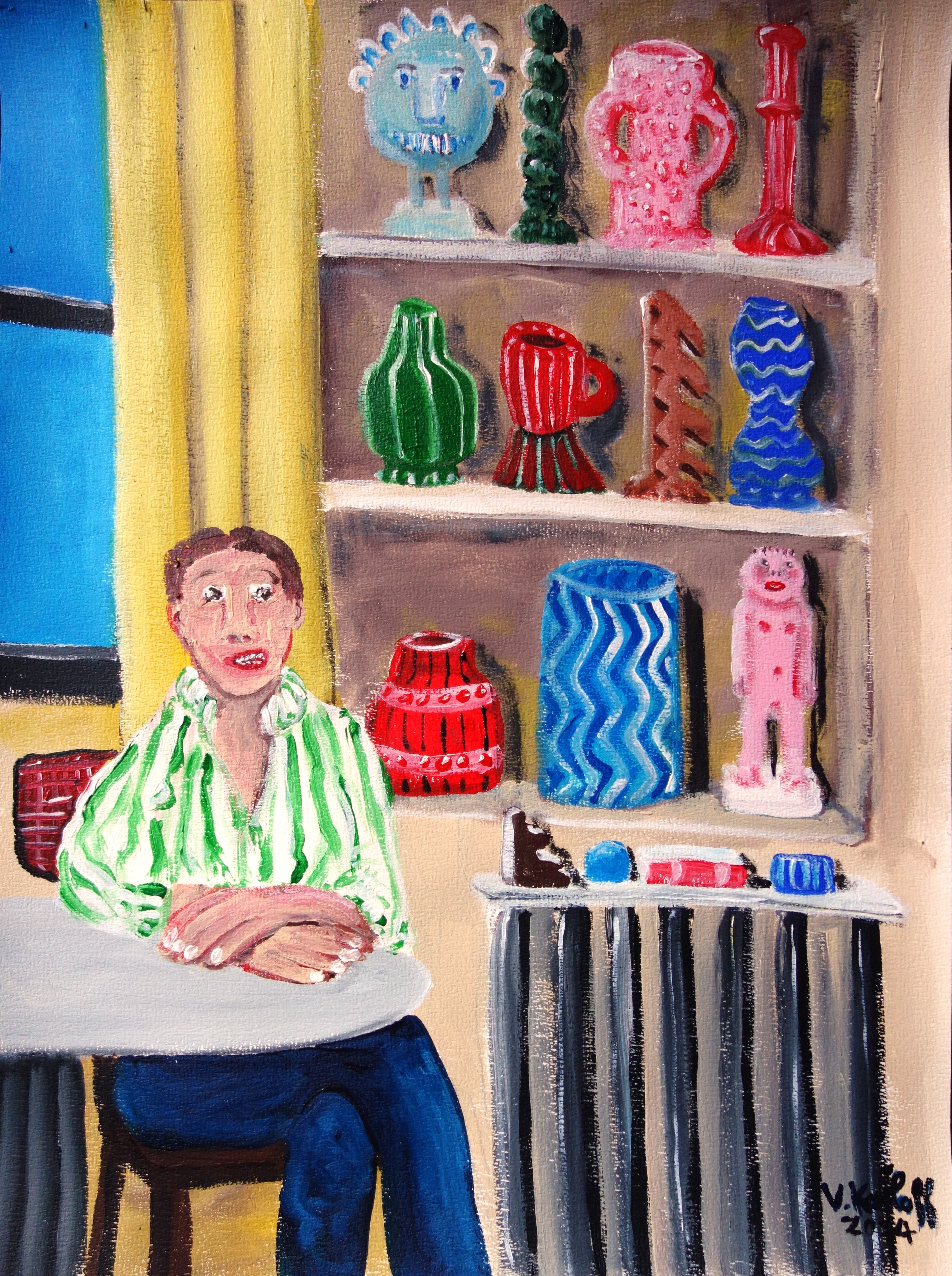 « Antoine n’était pas très à l’aise avec sa collection d’objets décoratifs. Il l’avait toujours détestée. Ce fut lors de son divorce qu’il mit tout en œuvre pour la récupérer, dans l’unique but de « bien faire chier mon ex femme », comme il le répétait sans cesse à son avocat. Ce combat juridique les avait littéralement ruinés. Depuis, non par choix esthétique mais motivé par la fierté perverse des victoires mesquines, Antoine arborait ladite collection dans son salon. » (Acrylique sur papier coton, grain torchon, 61/46cm, photos œuvre et détails)
