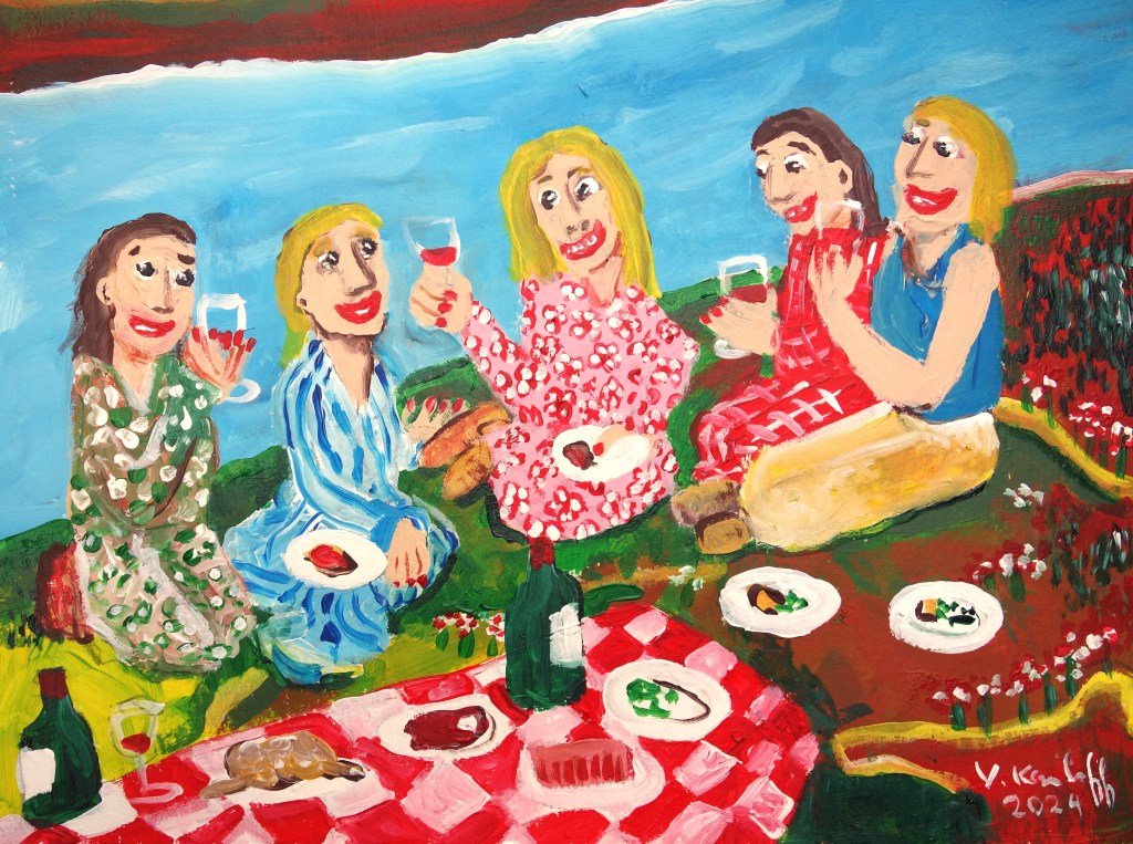 « Pendant le pique-nique, Garance profita d’être entourée par toutes ses amies pour leur annoncer la nouvelle : c’était décidé, à partir de ce jour elle serait toujours bienveillante dans ses propos à l’égard des gens pauvres et moches, et elle leur accorderait désormais une attention emplie de compassion. Toutes ses amies applaudirent de concert cette décision, et elles décidèrent de porter un toast … au courage. » (Acrylique sur papier, 40/30cm, photo œuvre et détails)
