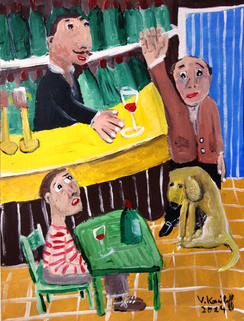 « Albert avait travaillé toute sa vie aux services culturels de sa ville. Arrivé à la retraite, conscient de l’inutilité de sa carrière professionnelle au sein de sa collectivité, et comme beaucoup de ses collègues à la culture, il finit alcoolique. Au fond la seule chose qui mettait tout le monde mal à l’aise au bistrot, c’était quand Albert était bourré : il faisait le salut nazi en gueulant ‘vive l’art contemporain’ en Allemand. » (Acrylique sur papier, 40/30cm.)