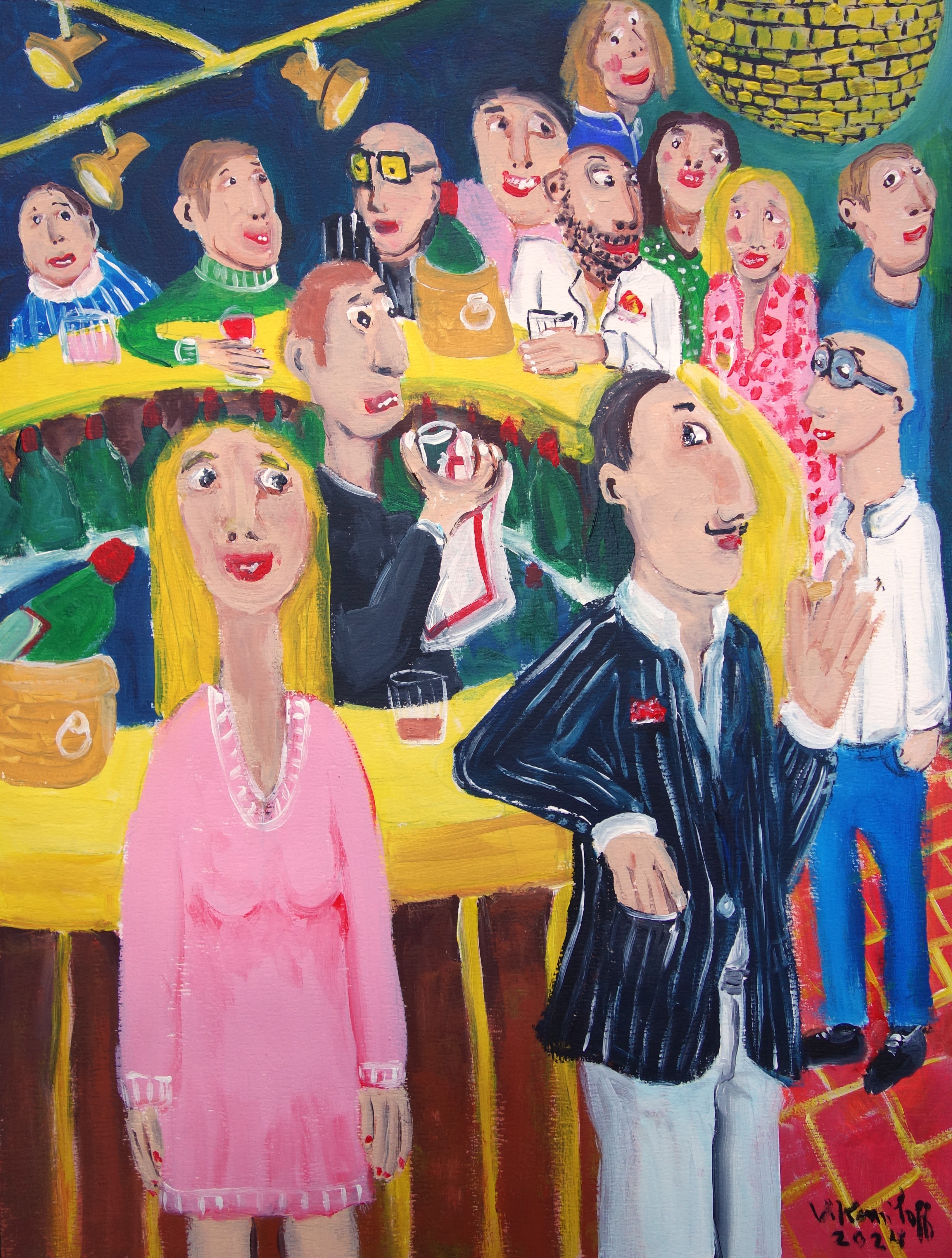 « La technique de drague en boite de nuit de Charles était bien rodée. Il suivait une règle infaillible qui lui permettait de ne jamais rentrer seul. Il draguait toujours sa propre femme. » (Acrylique sur papier coton, grain torchon, 61/46cm)