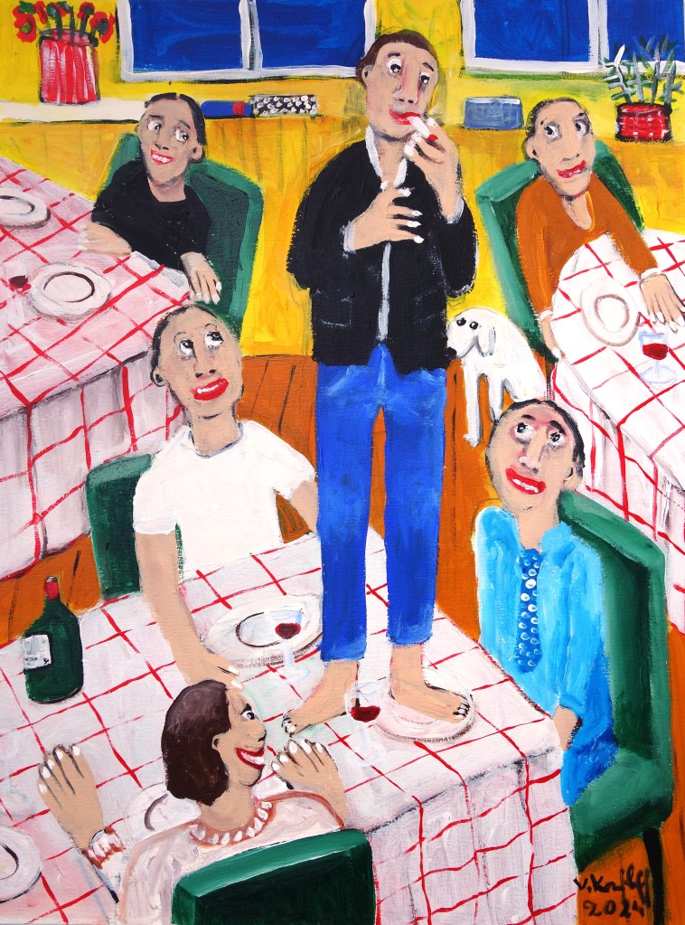 « Quand le PR (Parti du Rire) a pris le pouvoir, au début tout le monde se marrait. Puis ses représentants ont commencé à faire des blagues vraiment débiles et pas drôles du tout. Cependant, tétanisés par ce nouveau fascisme du rire, sans broncher, tout le monde continuait à rire… » Acrylique sur papier coton, grain torchon, 61/46cm