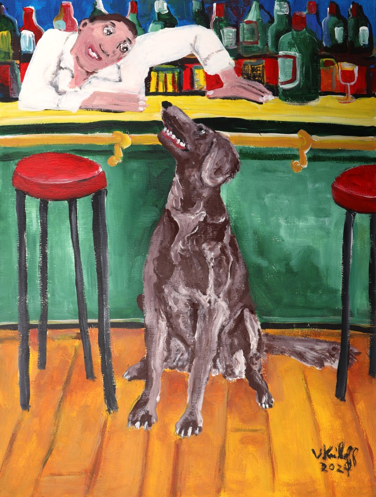 “Bertha était lasse des histoires d’un soir, et ce fut un soir d’hiver, dans un bar à Bruxelles, que sa vie bascula enfin. Dès que Bertha vit Karel, elle sentit qu’elle avait enfin rencontré l’amour de sa vie. Quant à Karel, il sentit qu’avec une haleine pareille, sa vie avec Bertha n’allait pas être facile tous les jours…” Acrylique sur papier coton, grain torchon, 61/46cm.