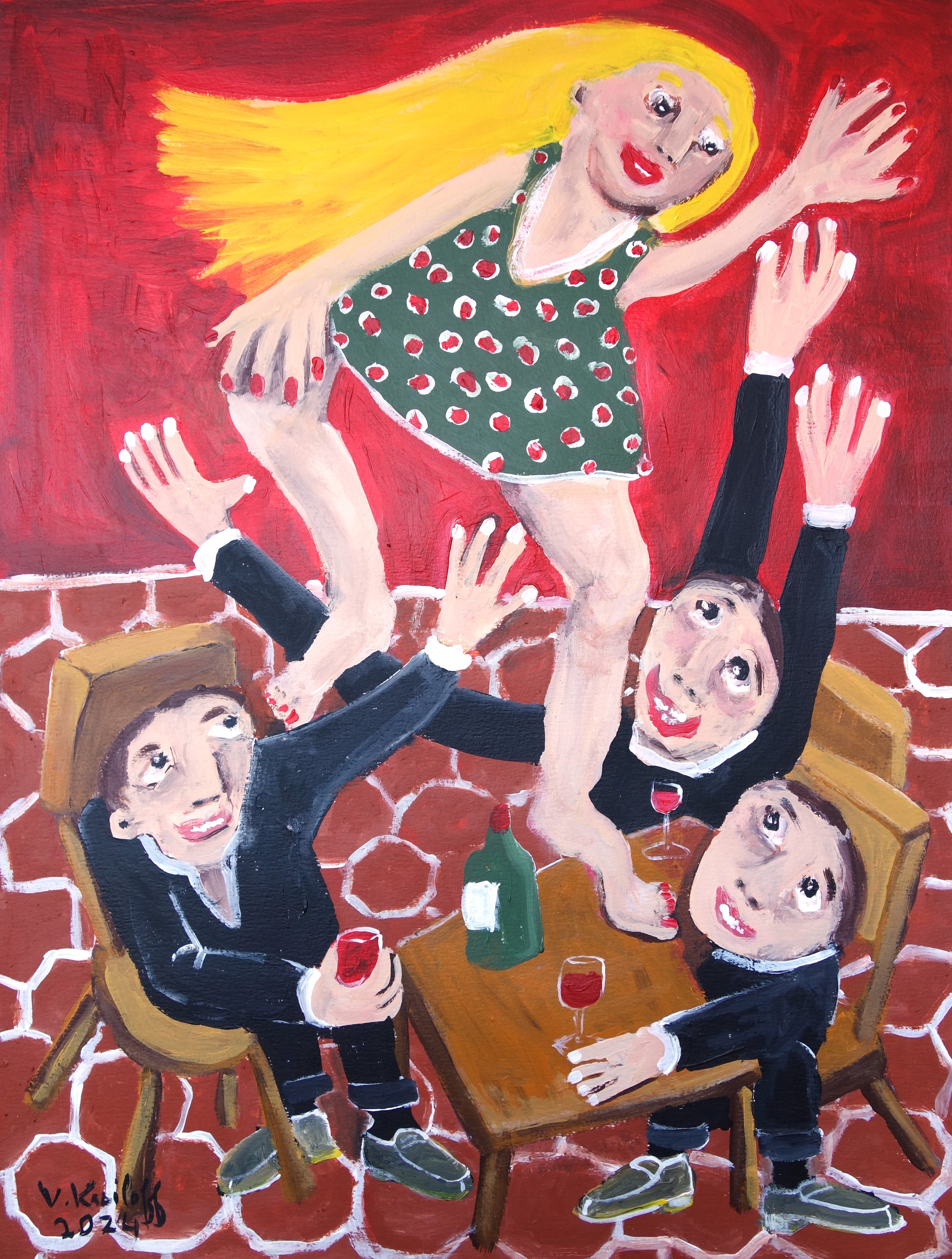 « Quand Daniel expliqua sa volonté de changer de sexe à ses trois amis, partenaires infatigables de beuveries, ils étaient plutôt partagés sur la question, voire un peu réticents. Puis, peu de temps après sa transition de genre, ses amis ont fini par admettre que Danielle avait bien plus de qualités aujourd’hui… » Acrylique sur papier coton, grain torchon, 61/46cm.