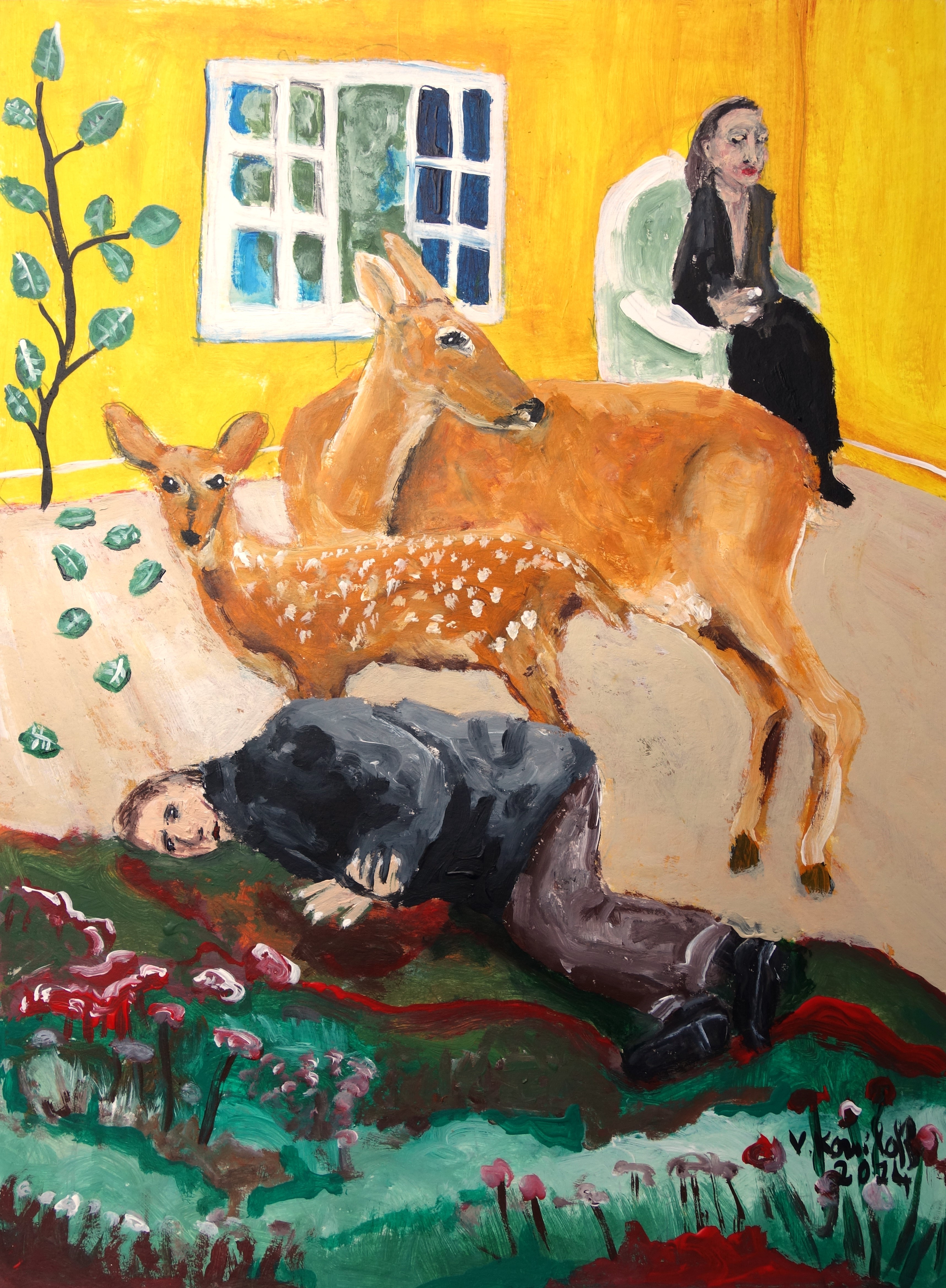 (Cette peinture est une commande. C’est l’histoire d’un deuil, celui d’un homme très âgé, qui n’arrive pas à se remettre de la disparition de sa femme, qu’il aimait visiblement d’un amour infini. Cette peinture est une vision personnelle d’une anecdote très précise que ce vieux monsieur m’a racontée. Étrangement, je ne sais pas si c’est ma « russitude » inconsciente qui me guide, mais je n’arrivais pas à détacher ma vision personnelle de cette anecdote du travail cinématographique du réalisateur génialissime Andreï Tarkovski. Le résultat est fatalement tarkovskien et confirme mon sentiment sur le tragique : comme la mélancolie, il en émane toujours une certaine beauté.)
