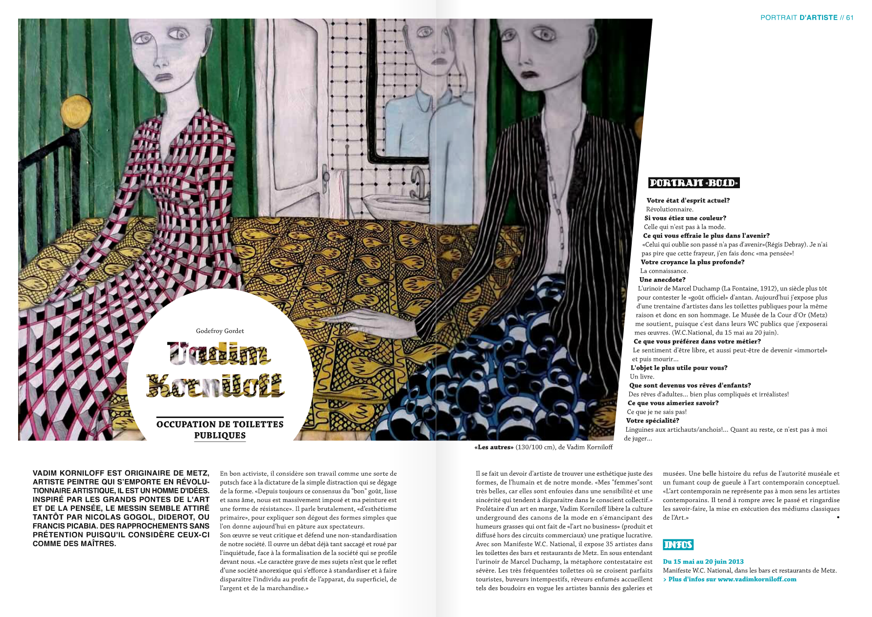 « En réaction à l’importance accordée par l’Etat à l’art dit « conceptuel » dans les galeries d’arts subventionnées, l’artiste peintre Vadim Korniloff a eu l’idée d’un Manifeste W.C National qui consiste à exposer 35 artistes dans les toilettes de restaurants et bars de Metz. Il place cette contestation de façon symbolique sous l’étendard de l’urinoir de Marcel Duchamp. Les W.C se transforment alors en salon des refusés et sert de pied de nez à l’art contemporain conceptuel. Choix d’ailleurs ironique s’il en est de Duchamp pour contester cette politique culturelle de sélection d’oeuvres en galerie. Vadim Korniloff a bien voulu répondre à quelques questions pour apporter plus de précisions sur sa démarche. »