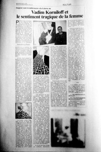 « L’autre valeur sûre de cet accrochage est le messin Vadim Korniloff. Le peintre à l’allure de dandy dont la production vogue entre la figuration narrative et le néo-expressionnisme aime à nimber son art d’une sorte de beauté convulsive et d’une bonne once d’esprit caustique. Pour lui l’art doit être source de réflexion et surtout d’émotion. Dans les œuvres exposées, rassemblées sous l’intitulé «Exposition des équilibres à l’endroit», il nous laisse à voir des images inspirées par le quotidien d’un monde qui marche sur la tête. Scènes de genre intimistes vigoureusement désenchantées mais non dénuées d’humour…noir, dé-formation des personnages à la Schiele, graphisme véhément, portrait sombre et acide de notre société contemporaine, Vadim Korniloff n’y va pas avec le revers du pinceau. Bien au contraire, il force le trait, bouleverse notre perception des choses et des êtres, nous pousse dans nos retranchements car ses modèles sont nos avatars avec nos travers, nos petites lâchetés et notre hypocrisie. Ses oeuvres sont des miroirs où nous plongeons notre regard et leur reflet nous entraîne vers le questionnement, l’introspection. Korniloff est piquant, il ne le renie pas et cela rehausse son travail au propos intelligent et intelligible. »(Nathalie Becker)